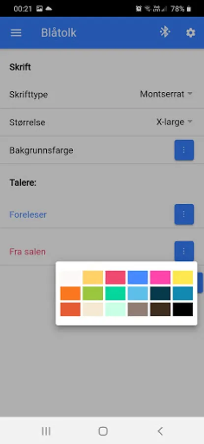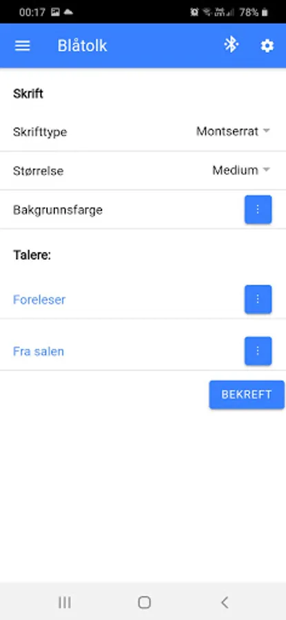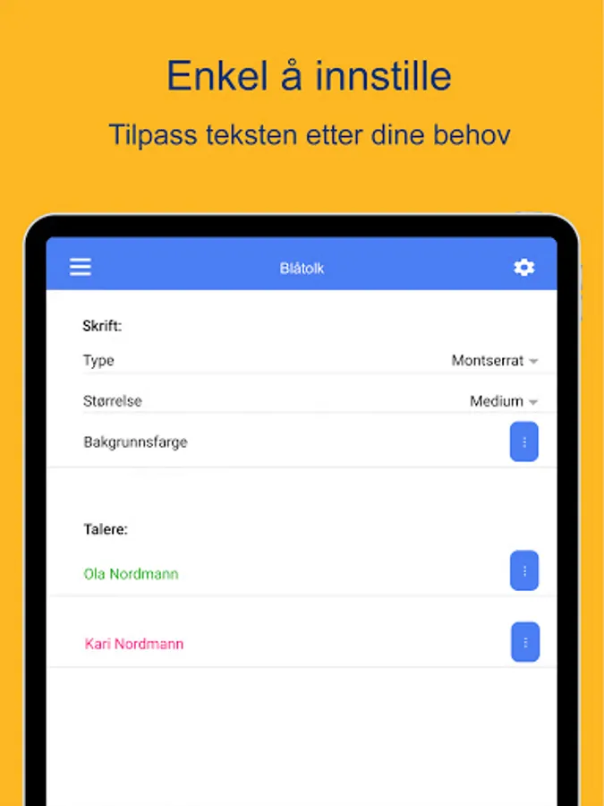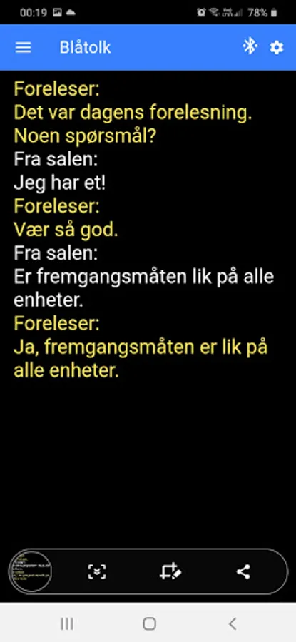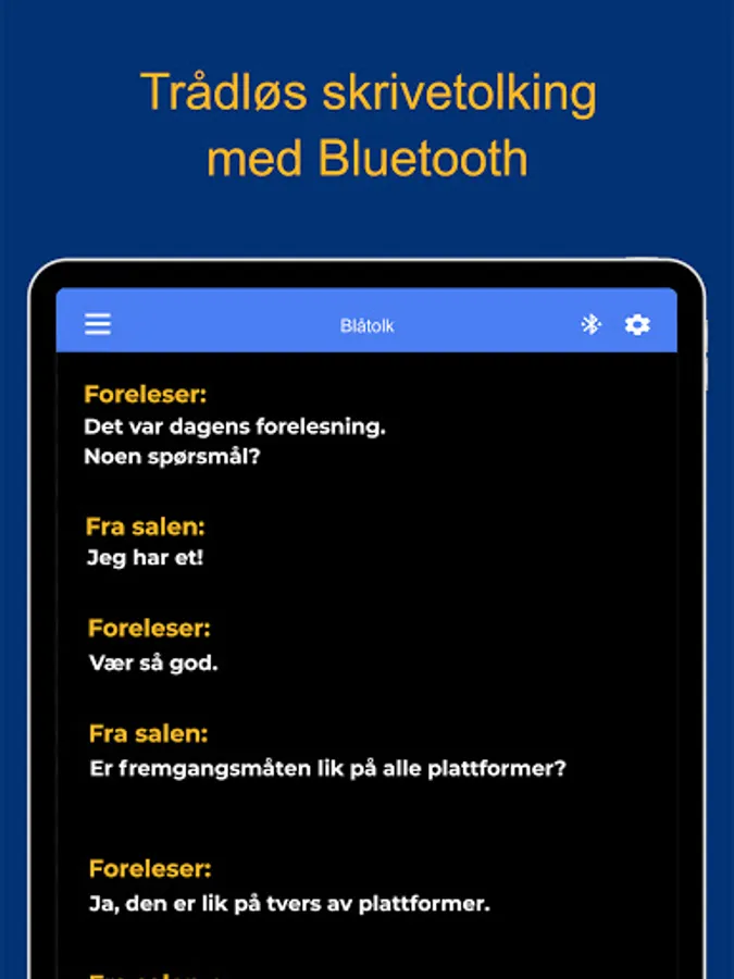 Blåtolk er et skrivetolkprogram som kan sende tekst trådløst til denne mottakerappen helt uten behov for hverken internett eller tredjepartsutstyr, takket være Bluetooth.