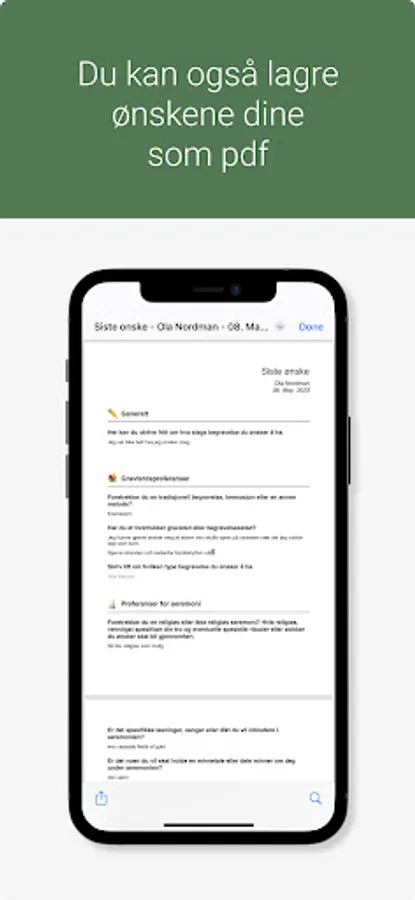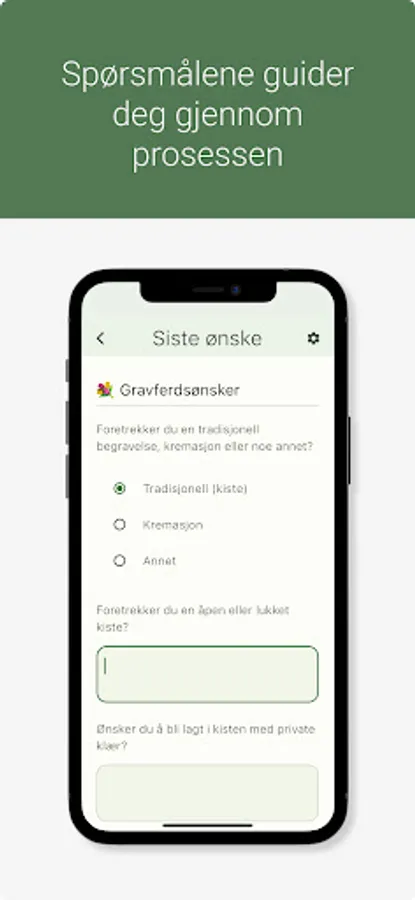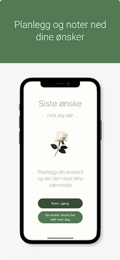 Siste Ønske is an app that helps you plan and adapt your funeral and funeral, so that your last wishes are fulfilled. With a user-friendly interface, you can easily explore and choose your preferences for the ceremony, burial site and any cultural or family traditions.
