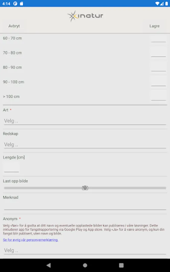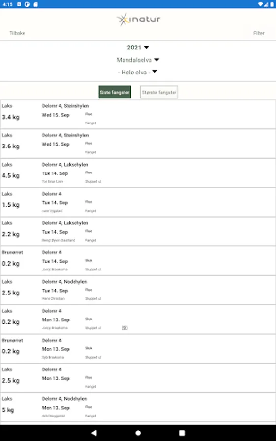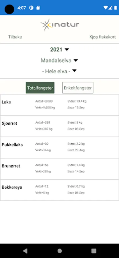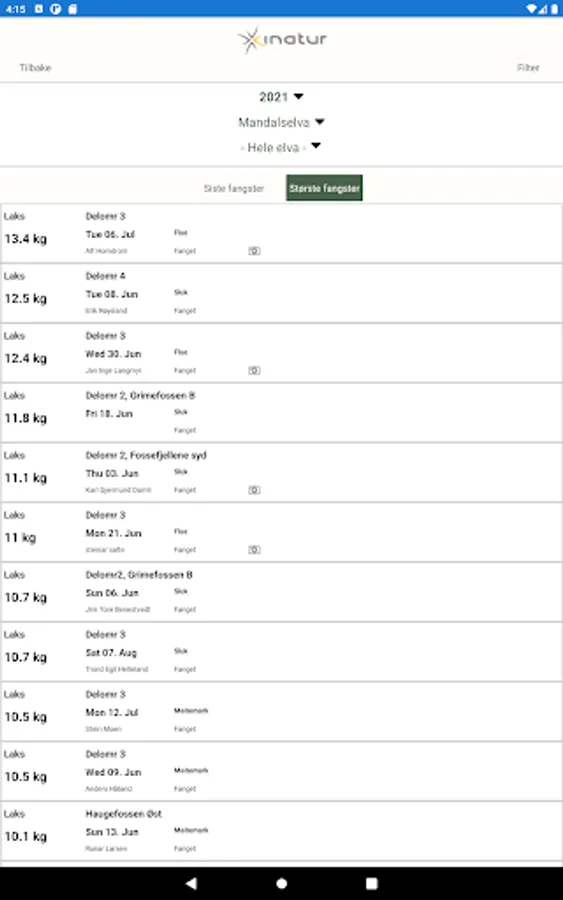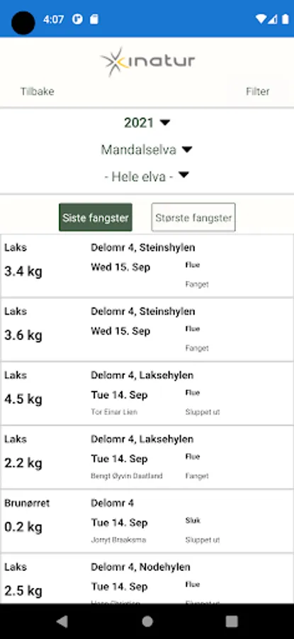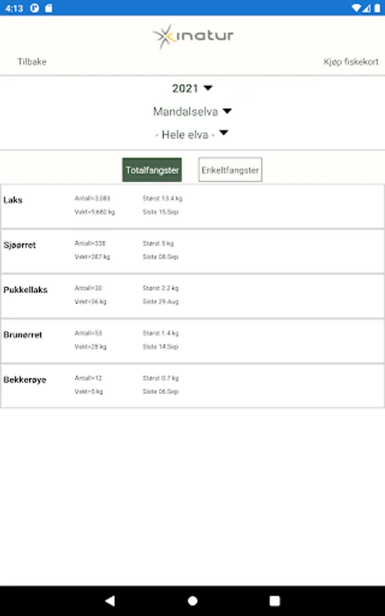 Inatur FangstApp allows you to report catches directly from the river. If you do not have mobile coverage, the report is stored locally and you can send it in later when you return to the coverage area. The app also contains a complete salmon exchange where you can see what is caught in all rivers where fishing licenses are sold at Inatur, search and sort by criteria, drill down on selection or see aggregate sums over time.
