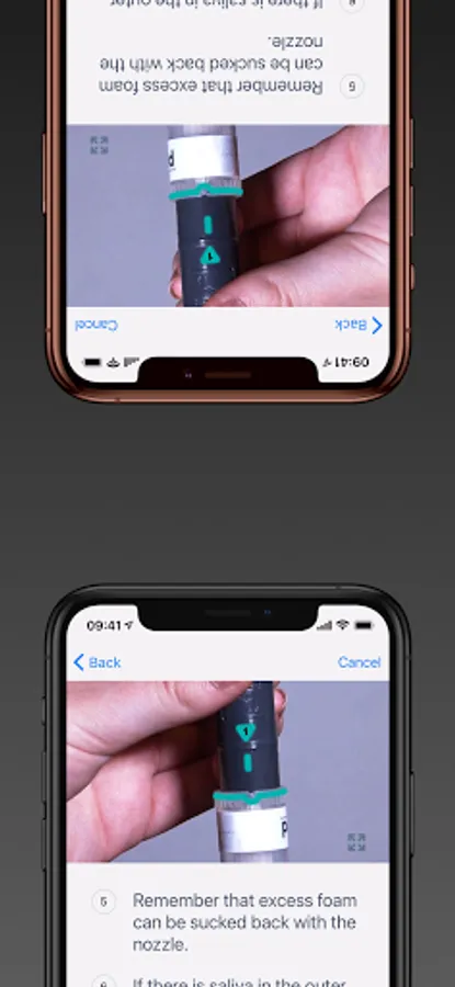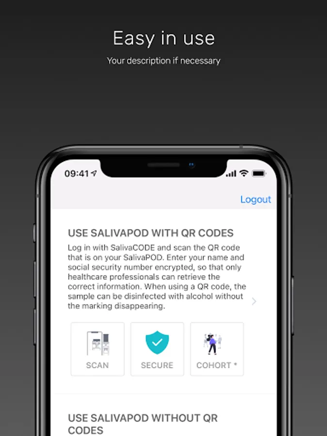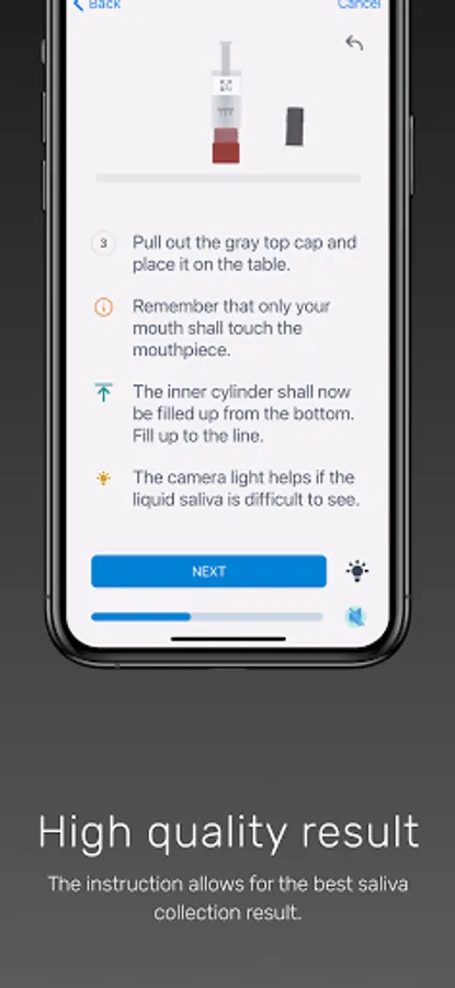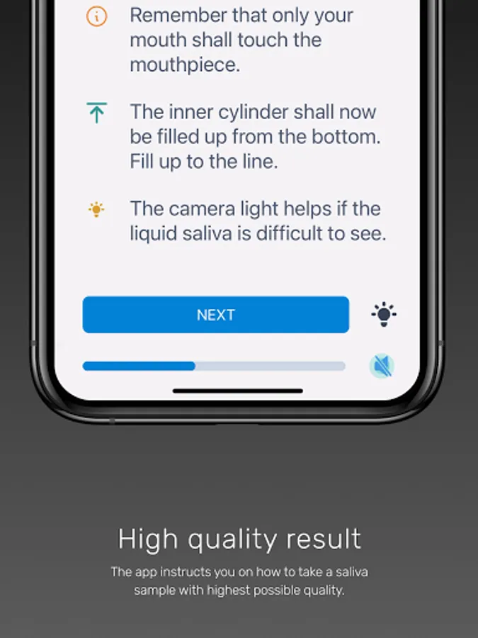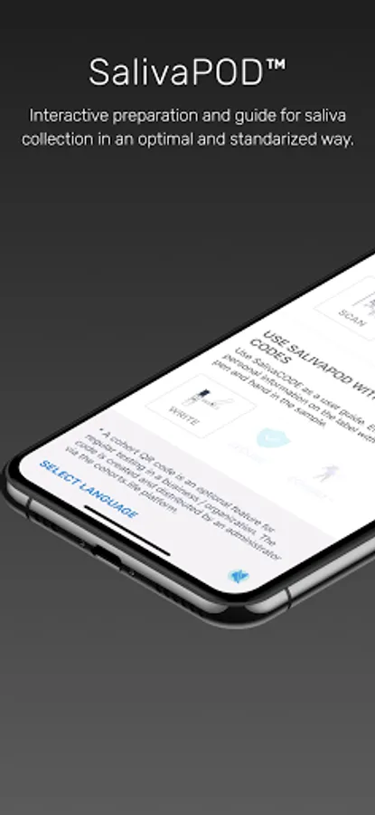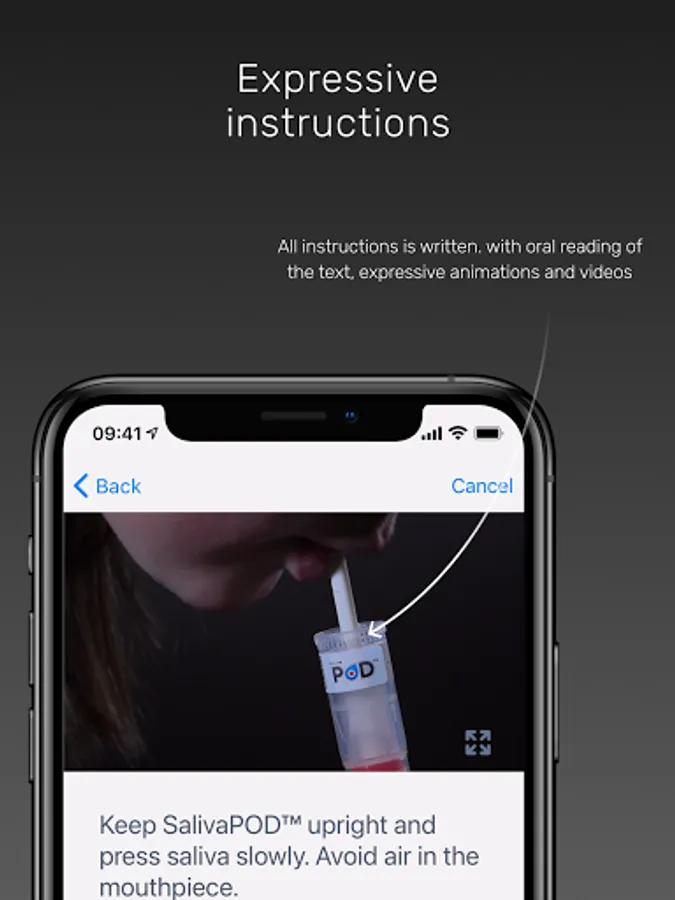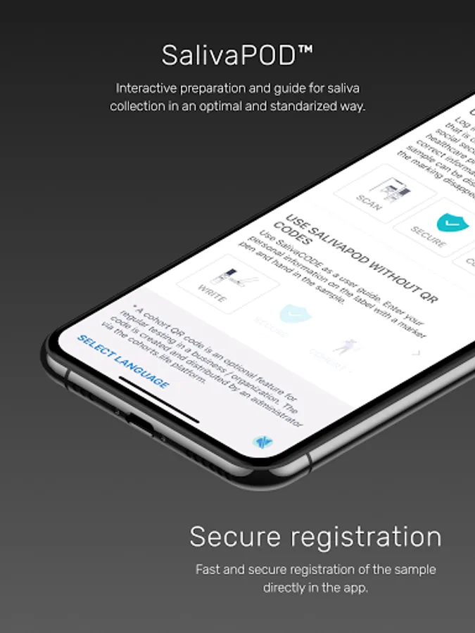 SalivaCODE ™ App is used for interactive preparation and guidance to a private person to perform saliva collection in an optimal and most standardized way. High-quality saliva for the detection of microbes is best done by not provoking saliva mixed with lumps, but rather allowing saliva to come naturally into the mouth and be transferred step by step into the fluid chamber.