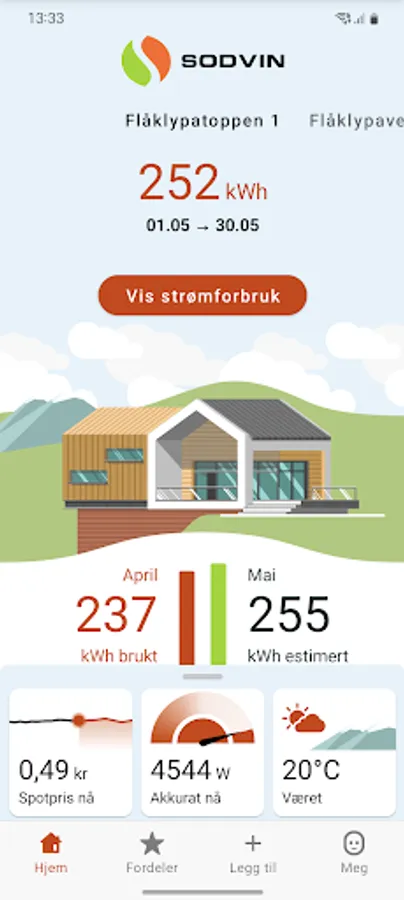 Download the Sodvin app and get control and an overview of your power consumption. With the app, you can charge the electric car when electricity is cheapest, connect smart products and see what effect season, weather, weekends and holidays have on your electricity consumption.