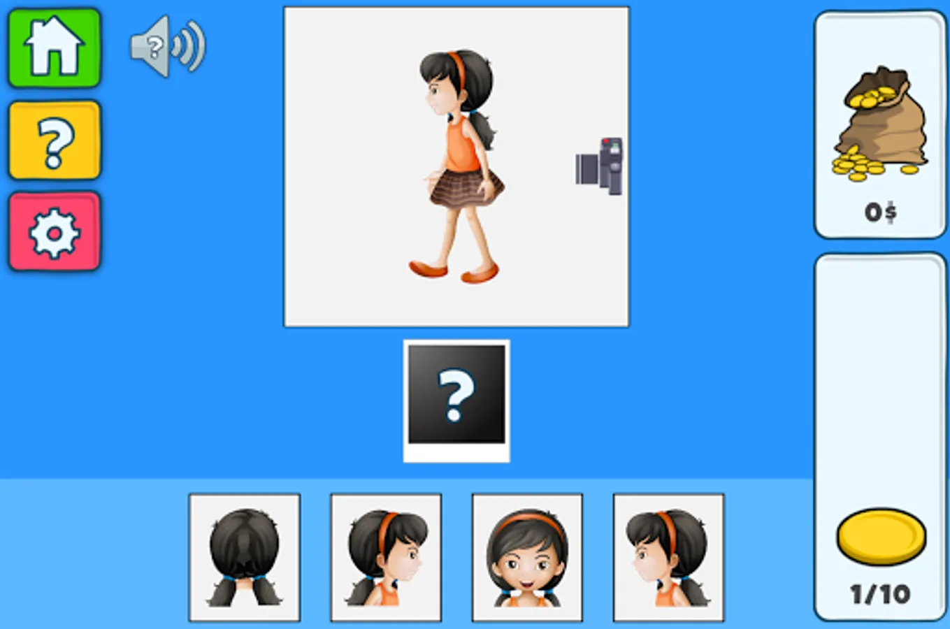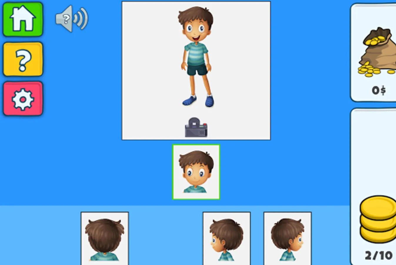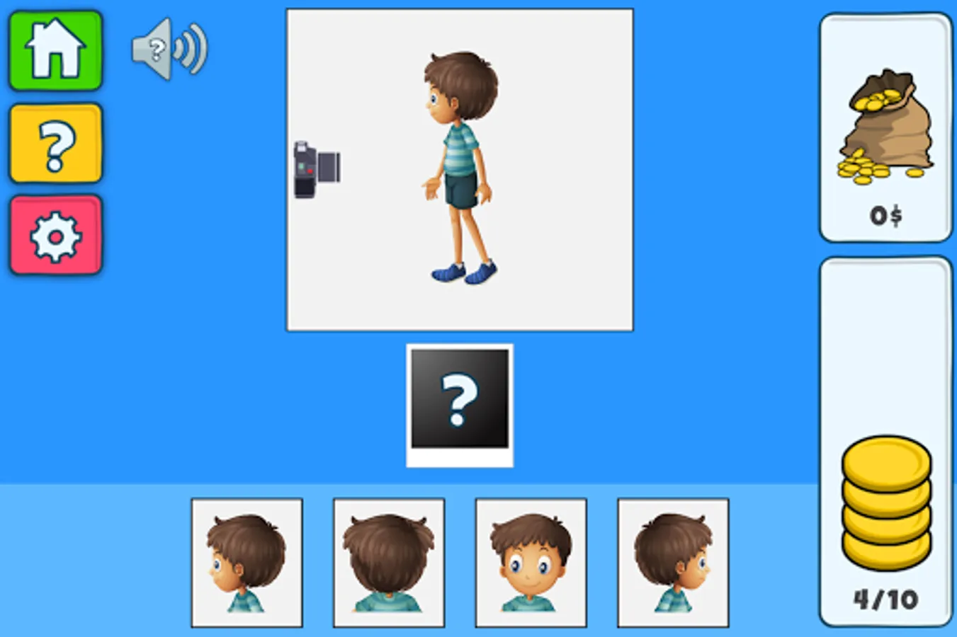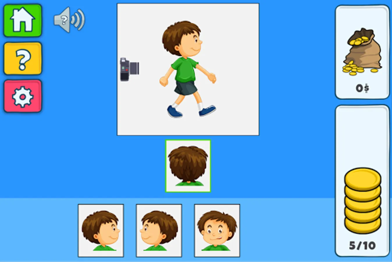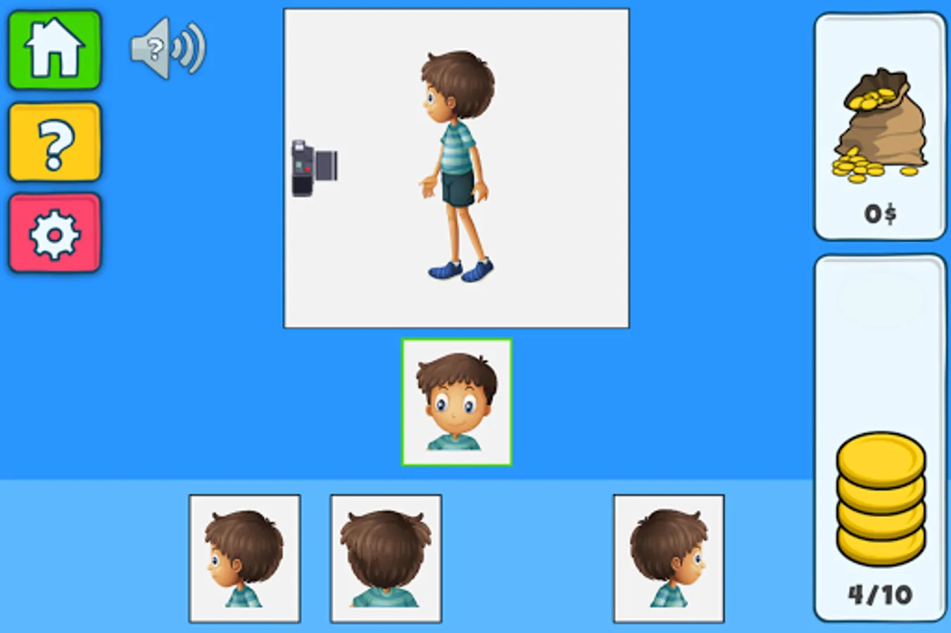 "Camera" is an app where you practice to imagine how things are. A camera is placed on the main image and the task is to determine which of the small images will display the image taken by the camera.