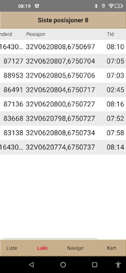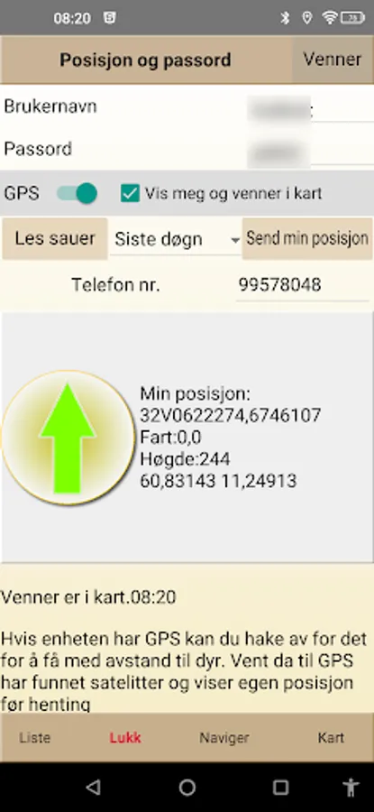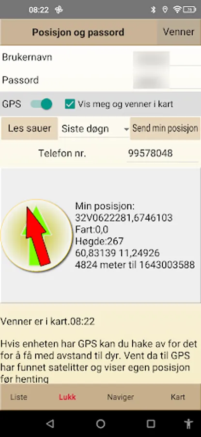 comes around the animal. Without a map, you can navigate to individual animals with arrows pointing in the direction you are going and where animals are. You can mark on the map before you go your position which leaves a tractor in the map, and the text the car in the list so that if you cannot find your way back, you can navigate back with the arrows or the map. If you need help, you can hold the field that shows your location, and it is on the clipboard in UTM format so that you can paste it into a text message where you ask for help.