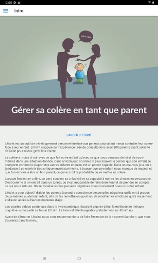 The app presents a selection of the most common negative thoughts that come to us before we get angry, as well as the most common alternative thoughts that can help us manage this anger. These thoughts were collected during sessions held with over 800 parents seeking help in dealing with their anger. If you do not recognize your thoughts in Littsint, you can write down your own negative and alternative thoughts there.