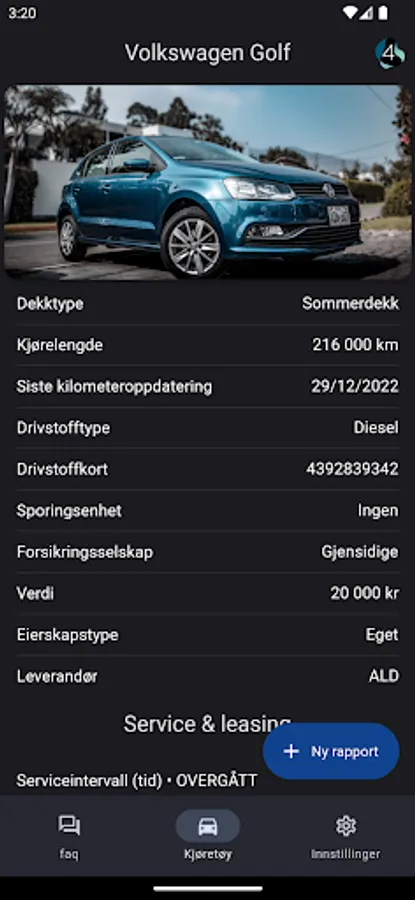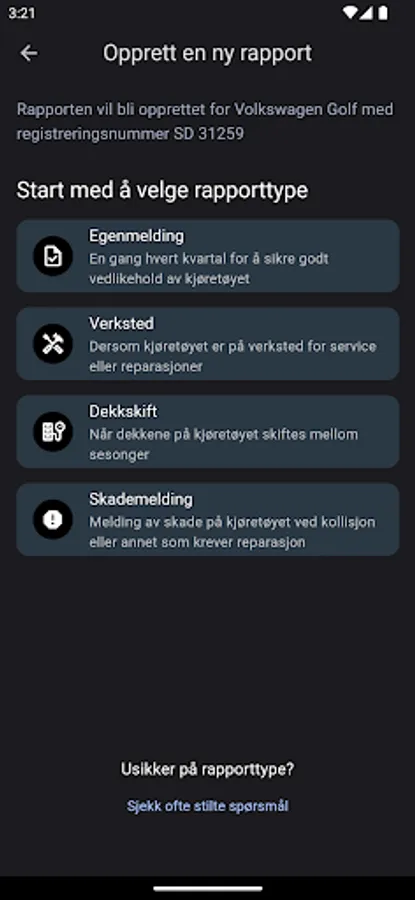 The app allows users to view their vehicles, submit reports, and get useful information about servicing, EU checks and other tasks.