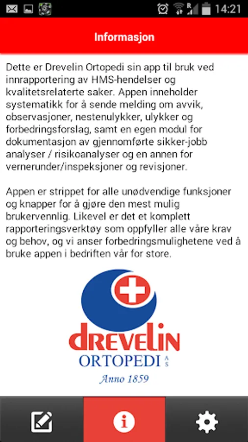 This is Drive Elin Orthopaedics AS 'app to use when reporting safety events and quality related matters. The app contains taxonomy to notify deviations, observations, near misses, accidents and improvement, as well as a separate module for documentation of completed job safety analysis / risk analysis and another for inspections and audits.