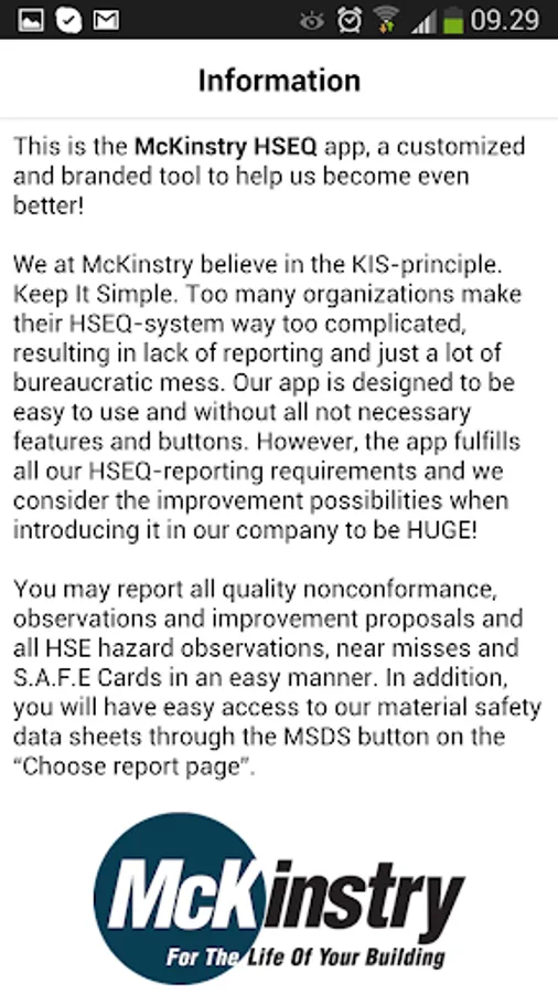 We at McKinstry believe in the KIS-principle. Keep It Simple. Too many organizations make their HSEQ-system way too complicated, resulting in lack of reporting and just a lot of bureaucratic mess. Our app is designed to be easy to use and without all not necessary features and buttons. However, the app fulfills all our HSEQ-reporting requirements and we consider the improvement possibilities when introducing it in our company to be HUGE!