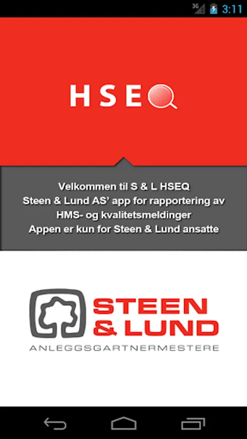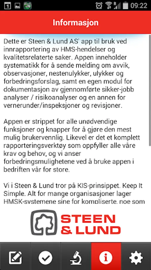 This is Steen Lund AS 'app to use when reporting safety events and quality related matters. The app contains taxonomy to notify deviations, observations, near misses, accidents and improvement, as well as a separate module for documentation of completed job safety analysis / risk analysis and another for inspections and audits.