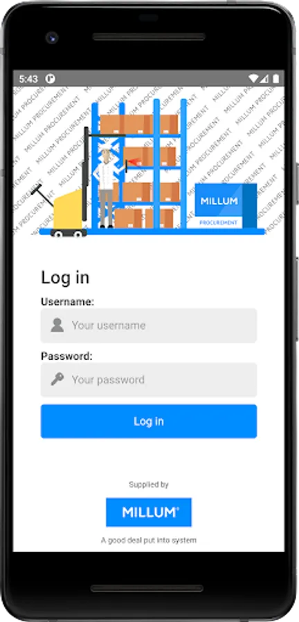 With Millum's inventory counting app, you can carry out your inventory counting seamlessly and easily wherever you are. To carry out an inventory count via the app, you have to start / retrieve an inventory count from Millum Procurement. You log in with your Millum Procurement username and password to gain access.