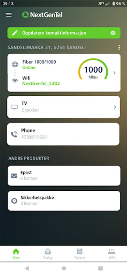 The NextGenTel app gives you a snapshot of your account, communication and invoices, as well as technical information and network messages.