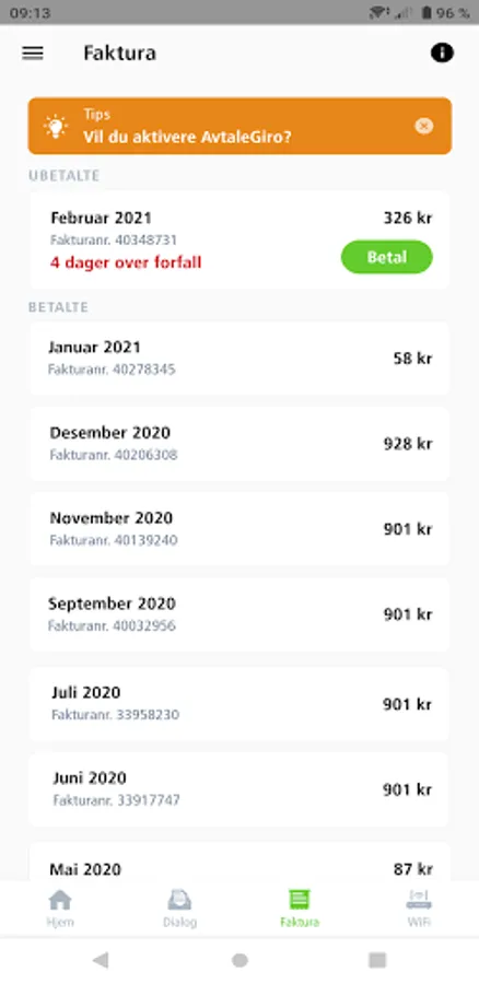 If you have unpaid invoices, find the payment information in the app – or even easier; pay directly with Vipps from the app.
