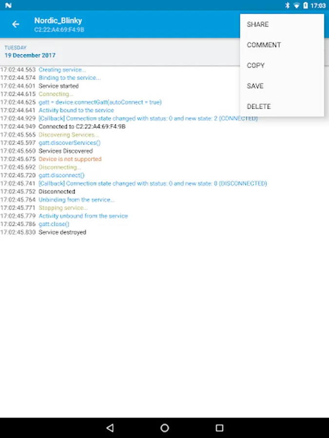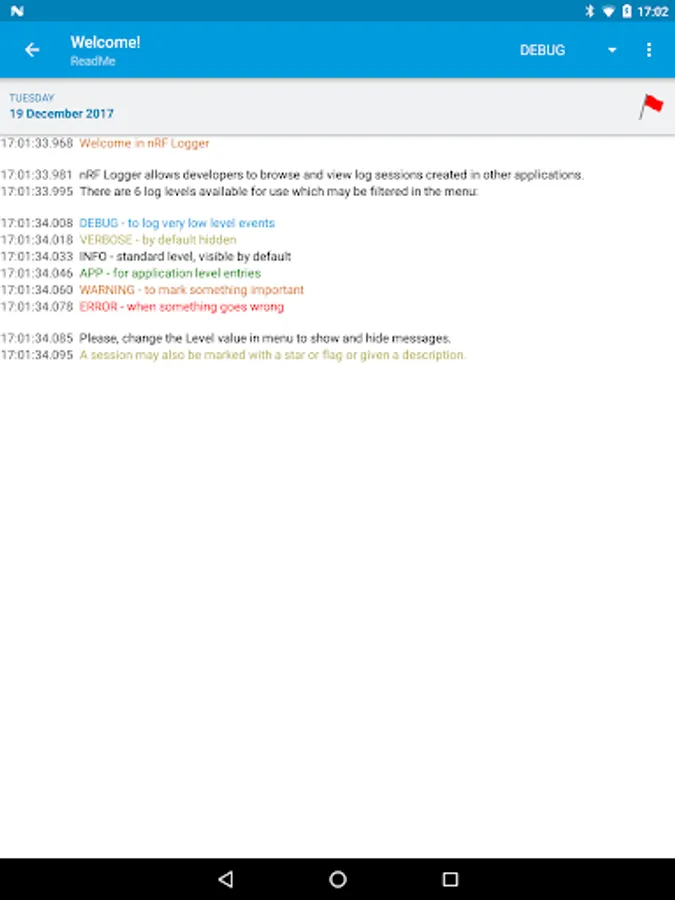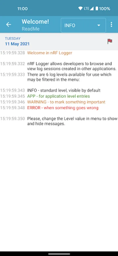 With nRF Logger installed developers may debug their apps when not connected to the computer. Log sessions may be also shared by customers to obtain detailed information.