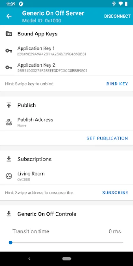 • Configuration: Setup your Application keys or use the randomly generated ones, add group addresses and configure your nodes into groups by simply setting their Subscription addresses.