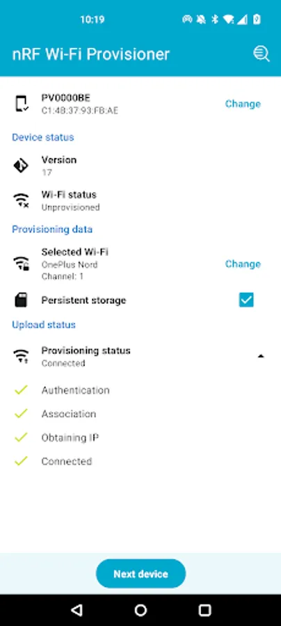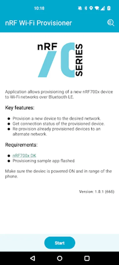 nRF Wi-Fi Provisioner app can be used to provision nRF7002 devices to Wi-Fi networks over an encrypted Bluetooth LE connection.