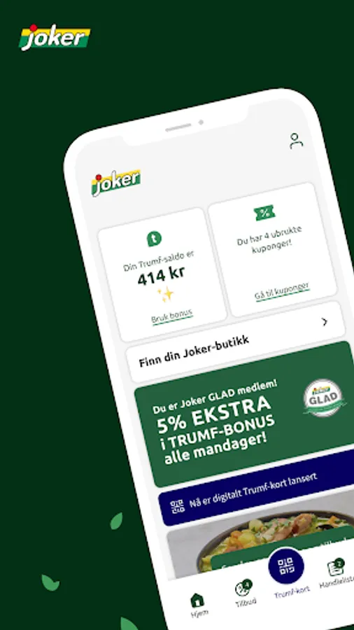 The app for those who love Joker. Full overview of Trumf balance, coupons and other good offers. You will also find your digital Trumf card in the app.