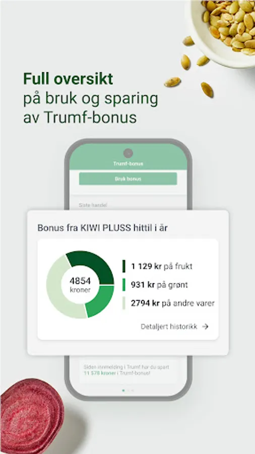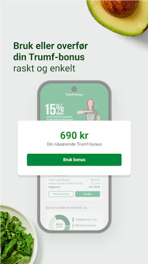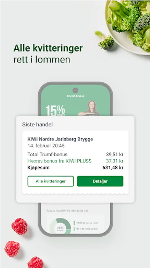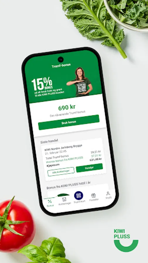 As a KIWI PLUS member, you get a total of 15% bonus on fresh fruit and vegetables, and 1% bonus on all other goods. If you are not already a member, it is easy to sign up. In the app, you always have access to your digital Trumf card, an overview of your latest receipts, the week's customer newsletter and full control of your Trumf bonus. Have you saved up a bonus amount that you want to use? In the app, it is easy to activate the bonus for use in KIWI stores, transfer the money to your bank account or donate it to a good cause.