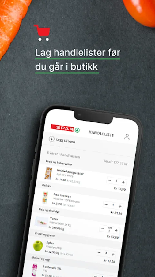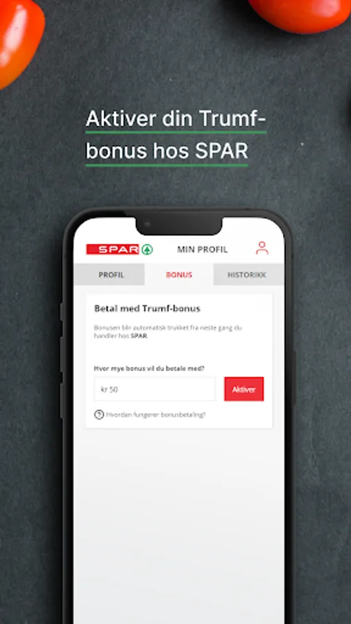 In the SPAR app, you will have an overview of all promotions and good offers at all times. You will see coupons and can activate them so that the discount is deducted at checkout. As a member of Trumf, you save bonus every time you shop at SPAR. In the app, you can monitor your Trumf bonus and activate bonus withdrawals for your next transaction at SPAR or EUROSPAR.