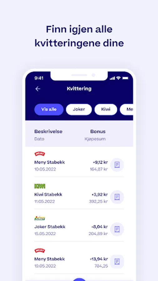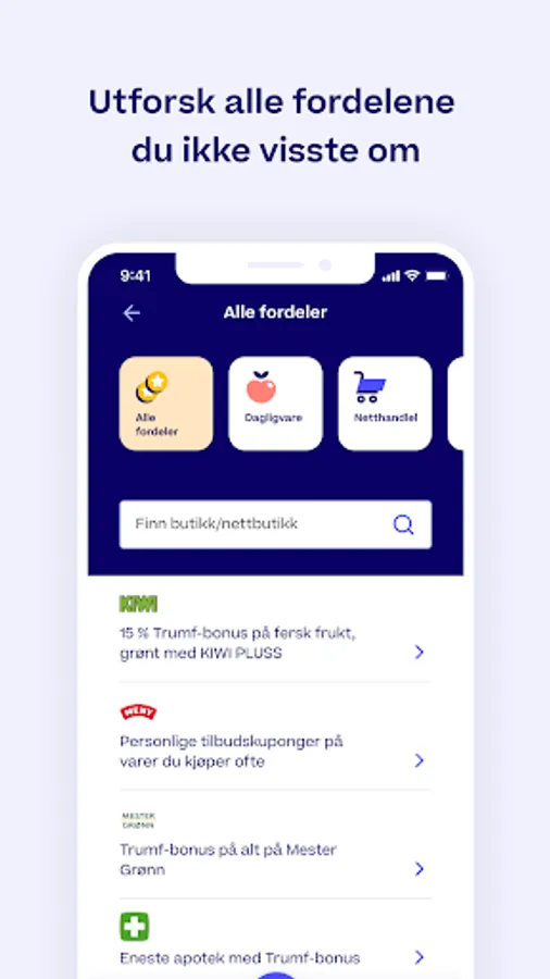• Activate bonus payment in store at KIWI, MENU, SPAR, Joker, Jacob's, CC Mat and Nærbutikken