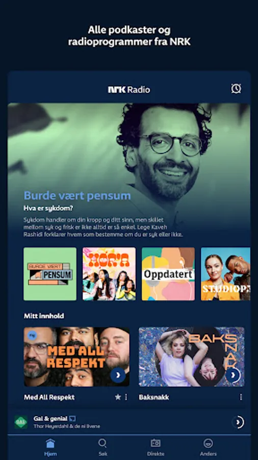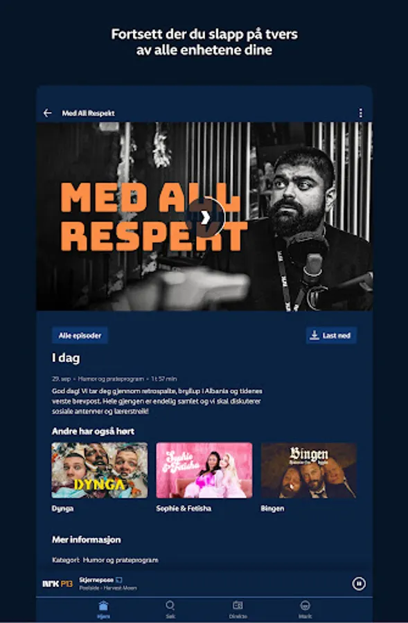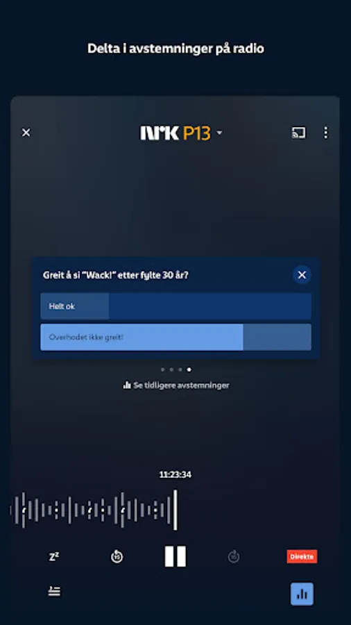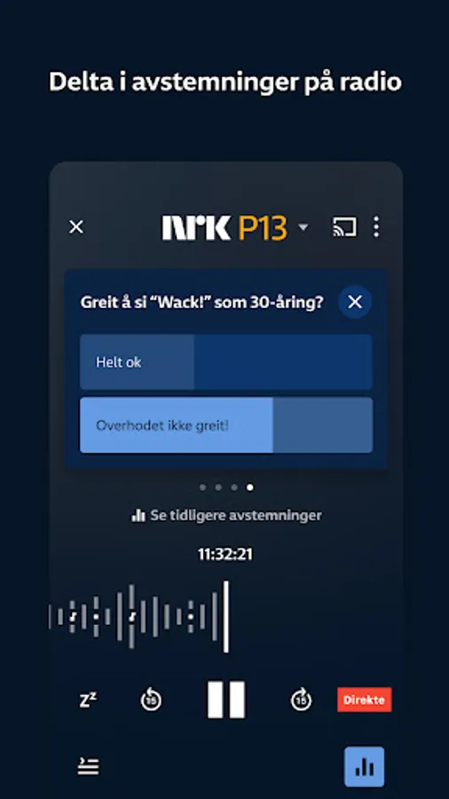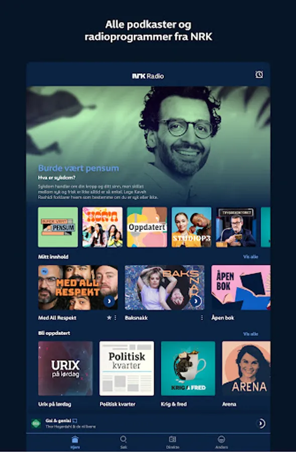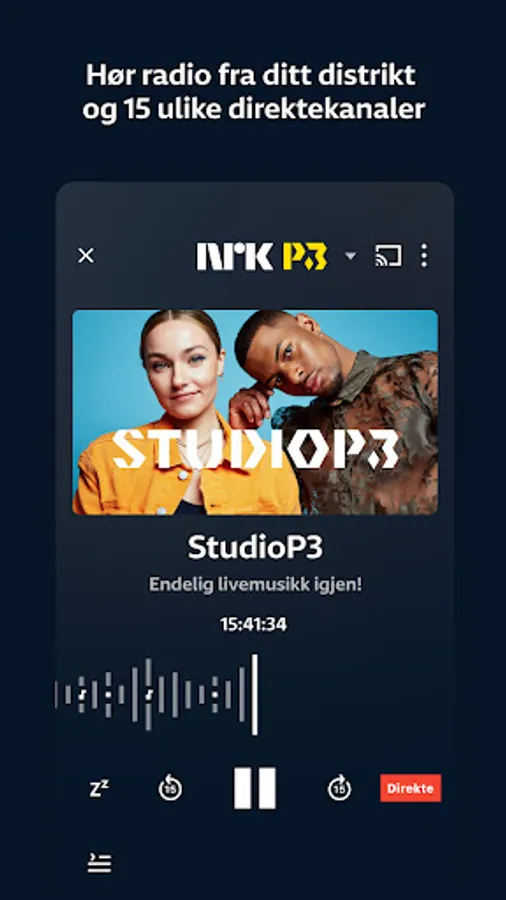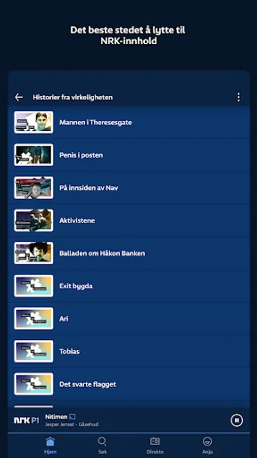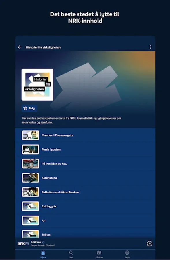 In the app you can also listen to live radio and rewind up to 3 hours back in NRK P1, NRK P2, NRK P3, NRK mP3, NRK Alltid Nyheter, NRK Radio Super, NRK Klassisk, NRK Sápmi, NRK Jazz, NRK Folkemusikk, NRK Urørt, NRK P3X in addition to all NRK's district broadcasts.