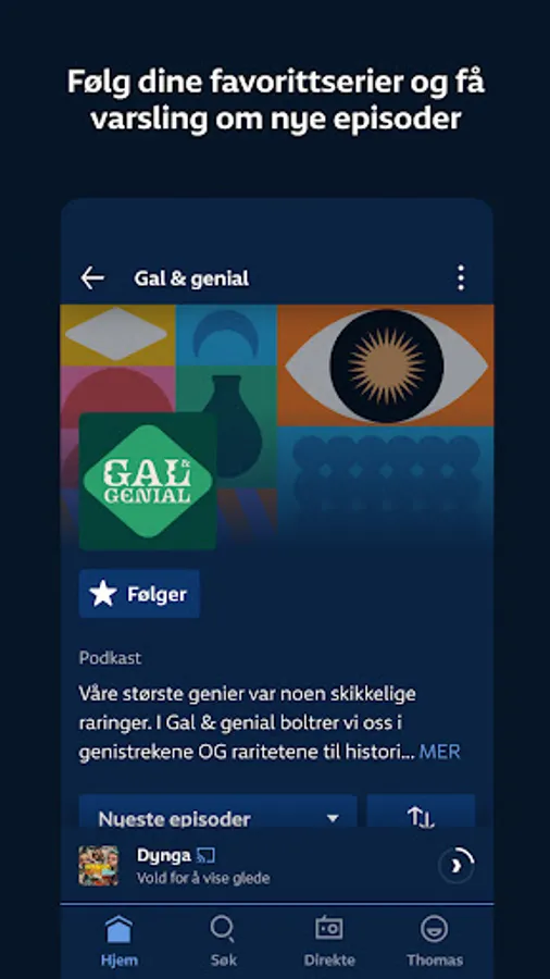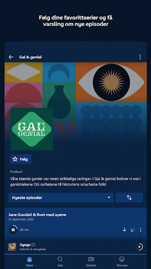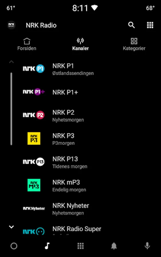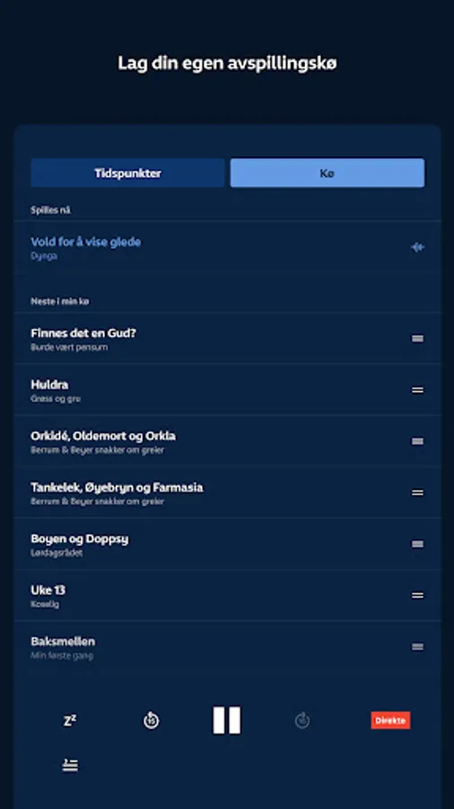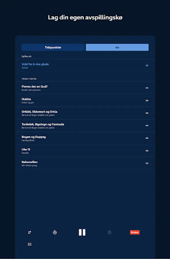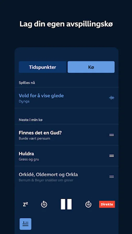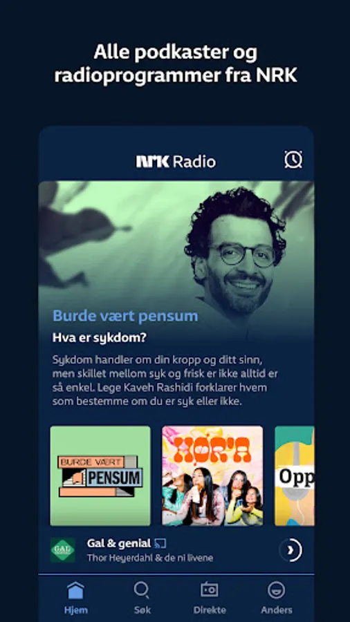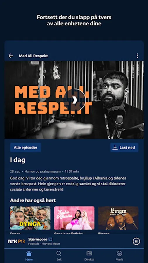 In the app you can also listen to live radio and rewind up to 3 hours back in NRK P1, NRK P2, NRK P3, NRK mP3, NRK Alltid Nyheter, NRK Radio Super, NRK Klassisk, NRK Sápmi, NRK Jazz, NRK Folkemusikk, NRK Urørt, NRK P3X in addition to all NRK's district broadcasts.