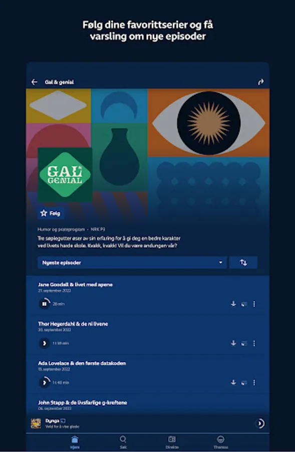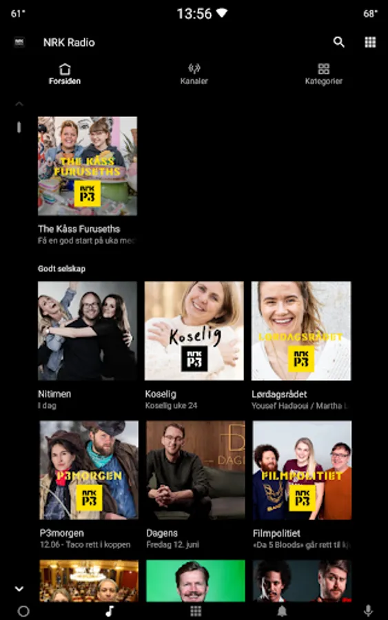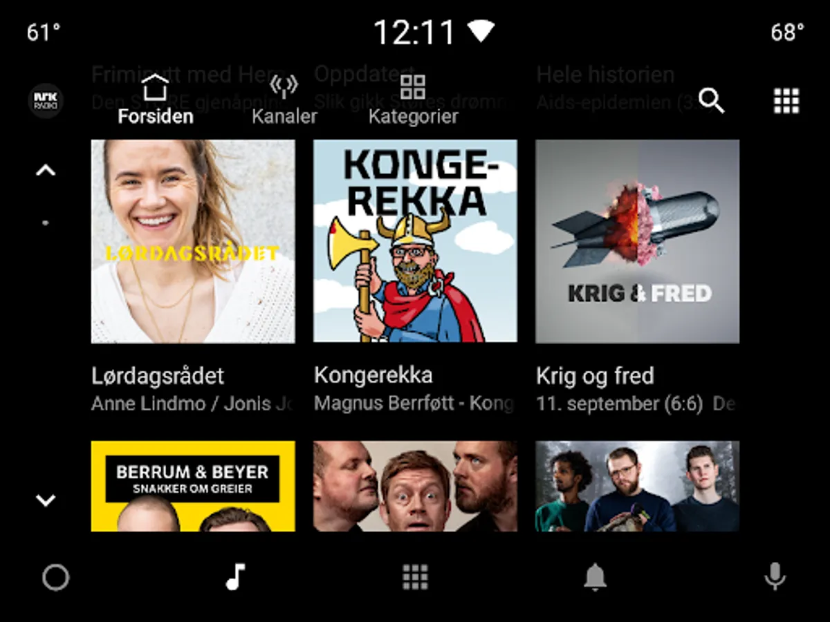 The NRK Radio app allows you to easily listen to all NRK's podcasts, live channels and recordings of radio programs.