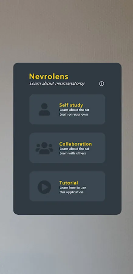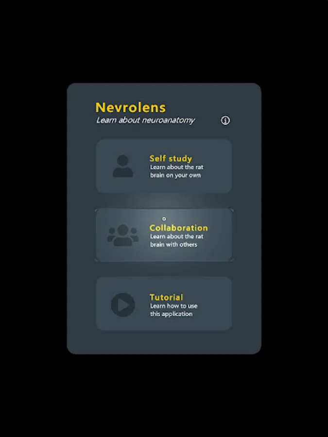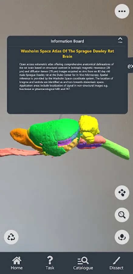 The Nevrolens app provides an augmented-reality experience for learning about the neuroanatomy of the rat brain. The brain system consists of a high-resolution 3D model of a rat brain model - the Waxholm Space atlas of the Sprague Dawley rat brain. The parts of the brain model are color-coded.