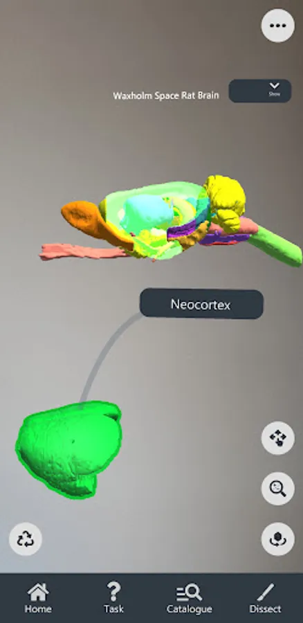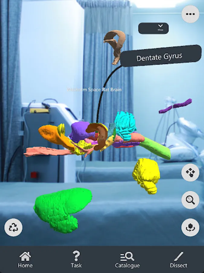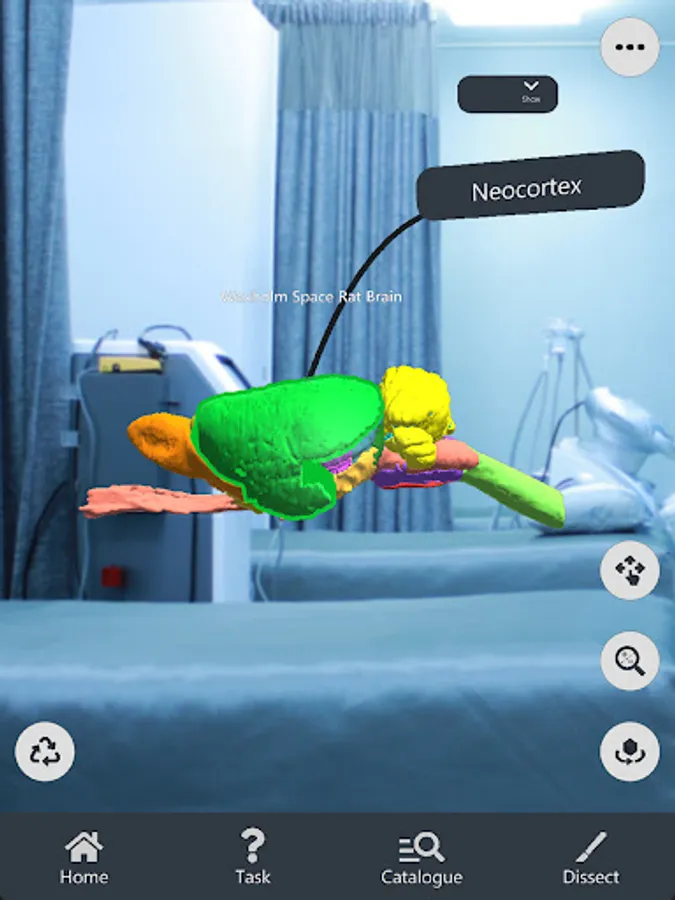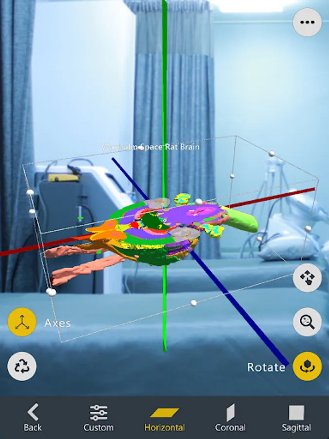 The Nevrolens app offers a feature for viewing the 3D model of the rat brain from multiple angles. The model can be placed in the physical space of the user and move the model around in augmented reality to view it from different perspectives.