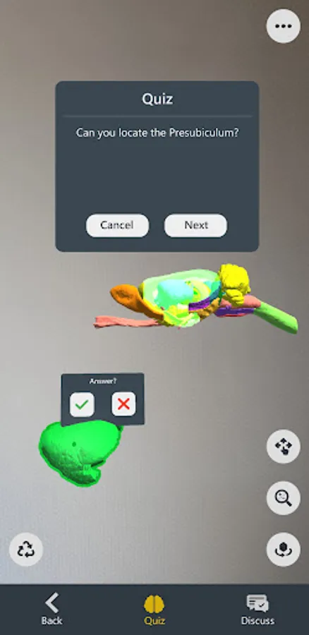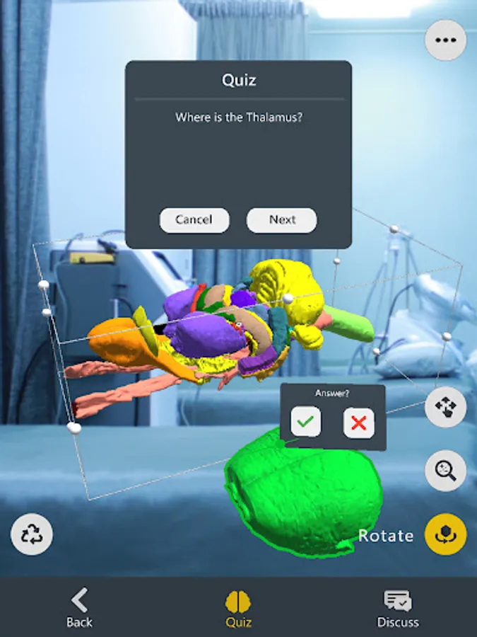 Quiz feature presents a question from a pool of 40 questions to the users that require selecting a brain part in the 3D model.