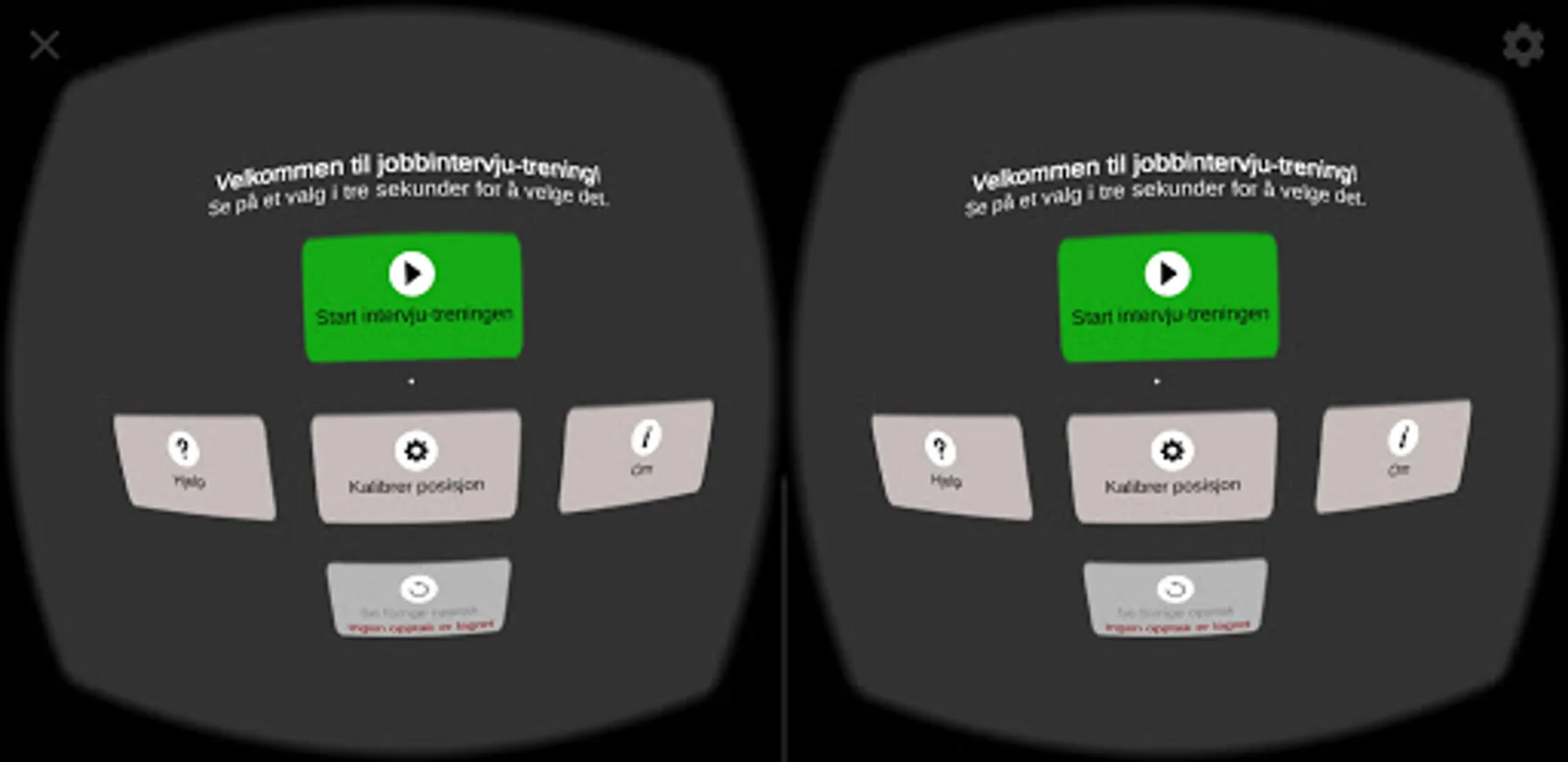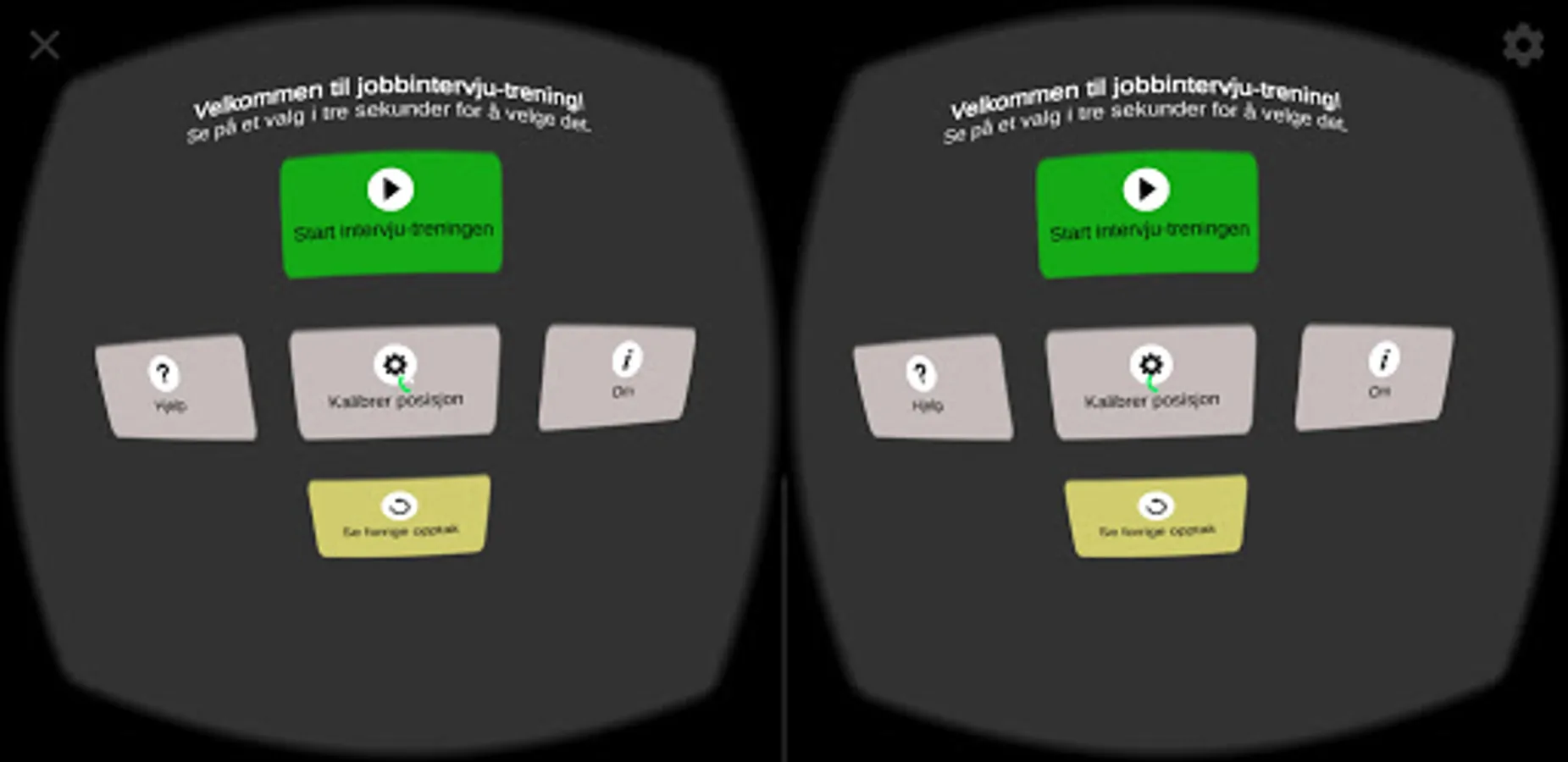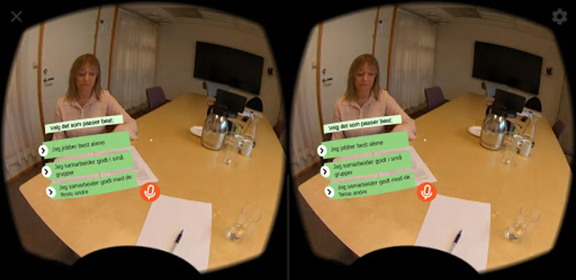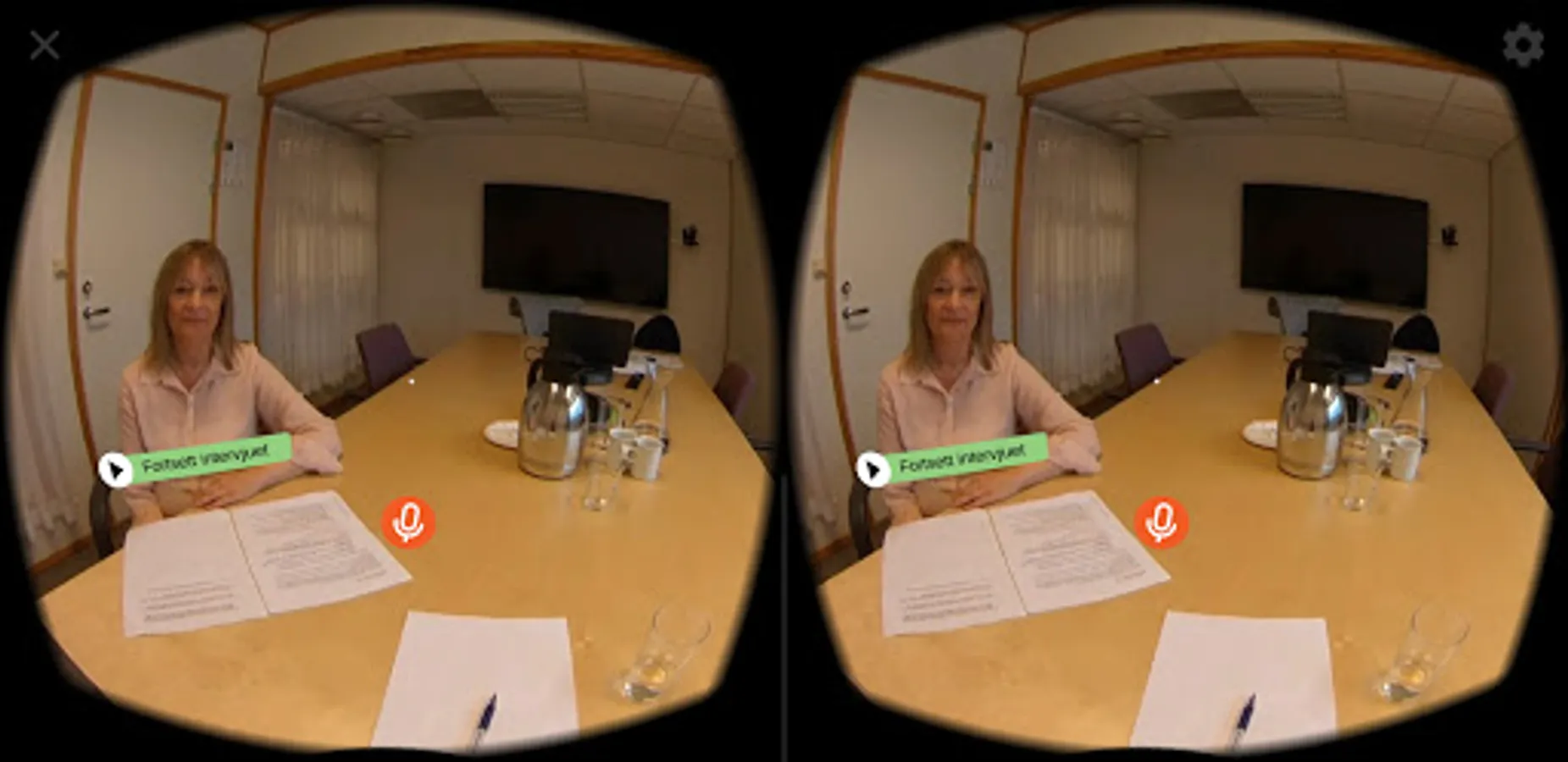 The "Job Interview VR" app provides a true-to-life experience of a job interview. The app can be used to train and prepare for a job interview. The simulation is based on a scenario that contains 12 main questions and 14 additional comments or questions that are displayed based on the answers to the main questions. In the interview scenario, the application user enters the role of job candidate and goes through a typical job interview. The interviewer is shown in a typical meeting room, in a 360-video format from the jobseeker's point of view. The purpose of the application is not to provide guidance and instruction in how to perform in a job interview. Instead, the application user is placed in situations where he or she has to answer questions from the interviewer. It is possible to record the answers given by the application user, so that the experience of the situation becomes more realistic. The recording can be played afterwards, intertwined with questions from the interviewer, which allows self-assessment and reflection.