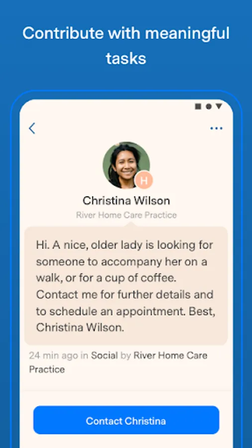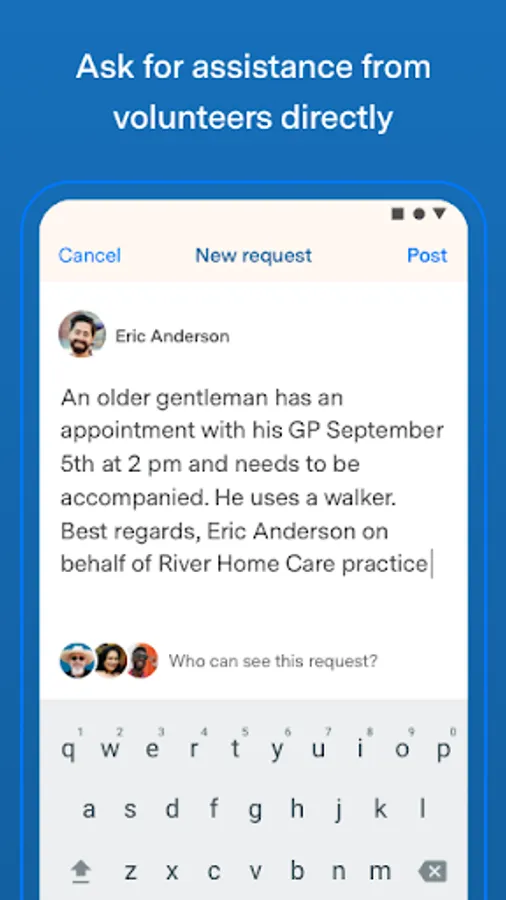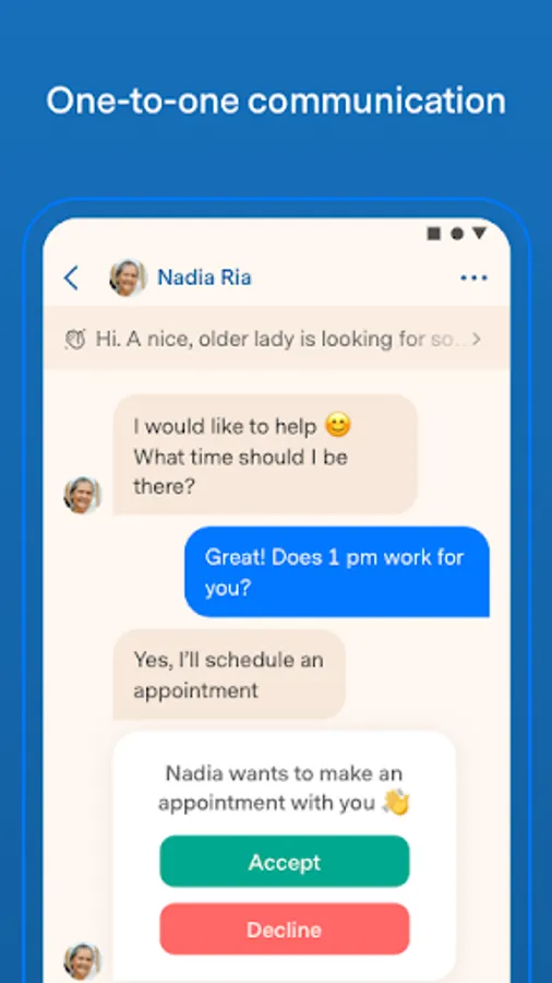 For example, you can easily request, for example, that someone can go to an appointment or follow the doctor, or you can even provide language training or help with using the computer. Everything is arranged using the app's messaging service and appointment feature. And, if you are wondering about something, your group leader is available just one click away.