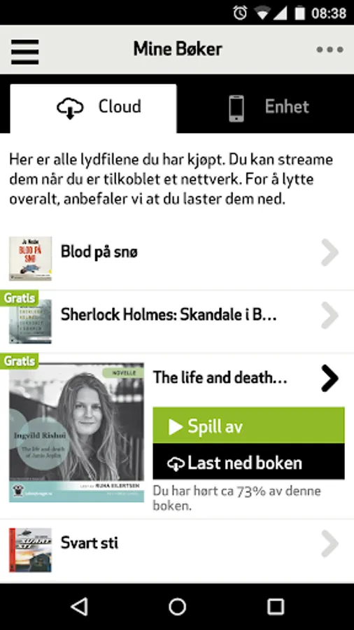 - Download and / or stream audio books from Lydbokforlaget directly from your android device.