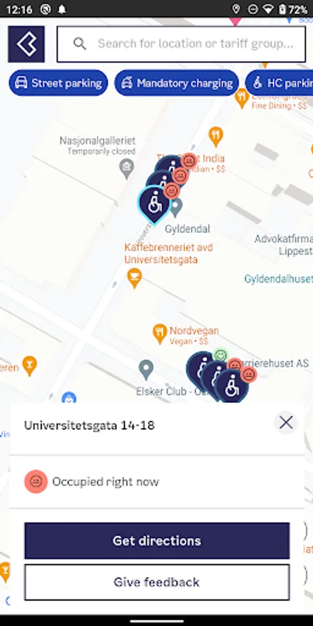 The app contains a map of all public HC parking spaces in Oslo. By pressing the HC parking icons in the map you get directions for driving.