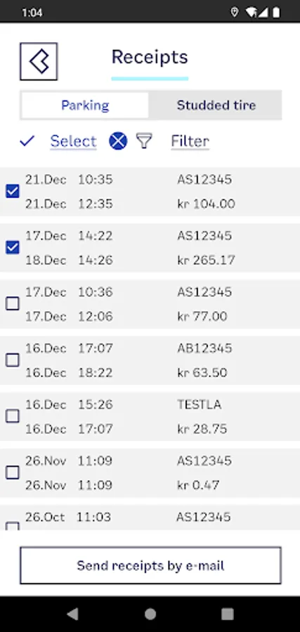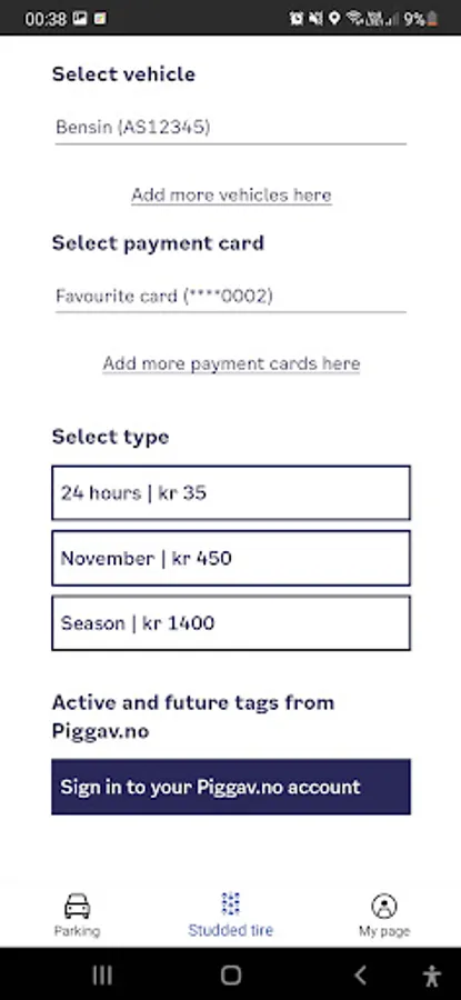 You can pay the daily, monthly and seasonal studded tire fee in the app. The daily fee is valid for 24 hours and the monthly fee is valid for the current month. The seasonal fee can be canceled and you are refunded for the remaining period of the season. It is possible to transfer the active studded tire fee bought for the season to another car once.