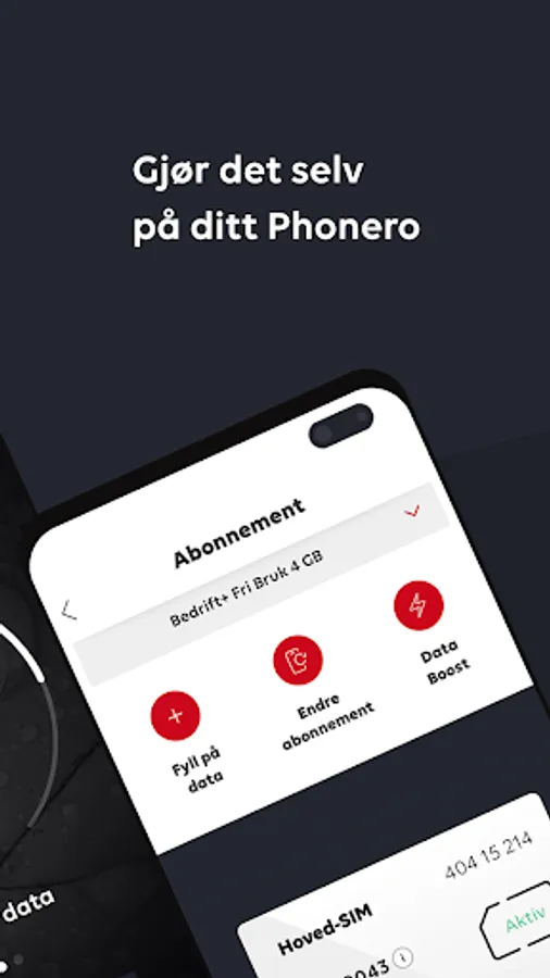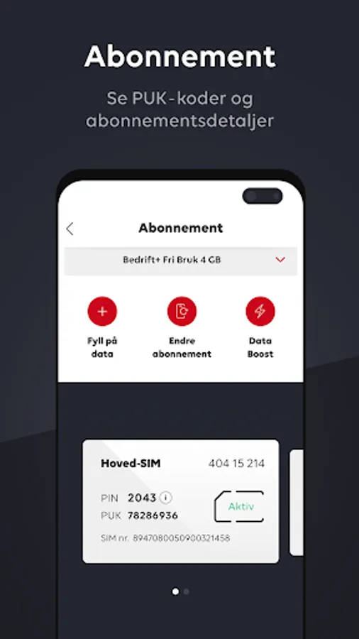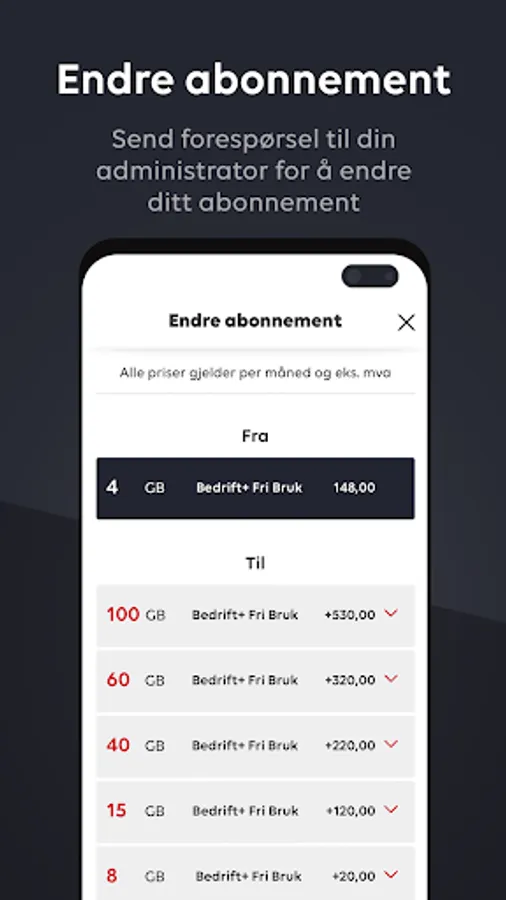 In the app you will find information about your subscription, consumption and services. You can also order additional services and extra data for use in Norway and abroad. Pay yourself with Vipps or order on company invoices. You can also change your subscription by sending a request to the administrator of your company. The administrator can easily approve the request via SMS.