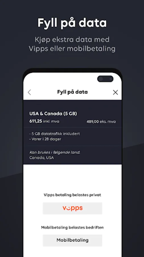 - Load data domestically and abroad with Vipps or Mobile payment