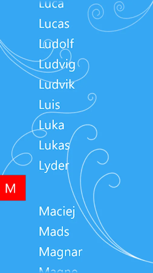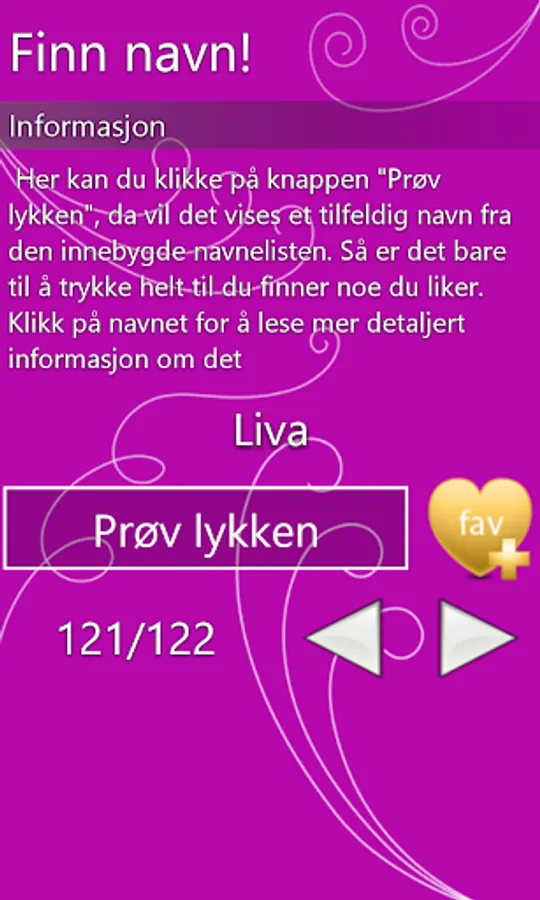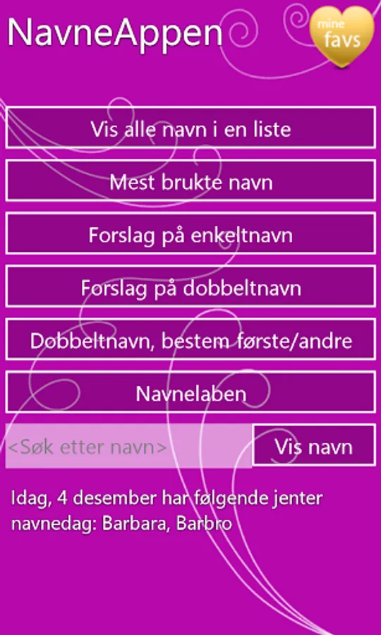 NavneAppen is an app which contains a total of more than 2600 names! In addition to the name, the name description, information about the name day, how many people use the name and graphic description of the use of most names.