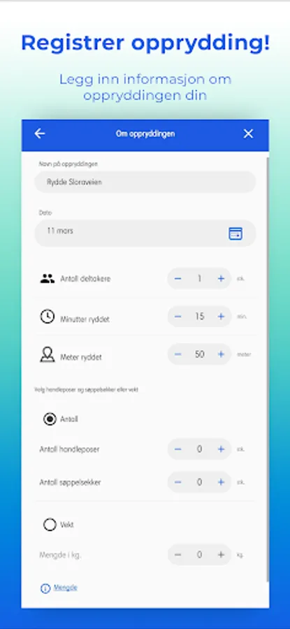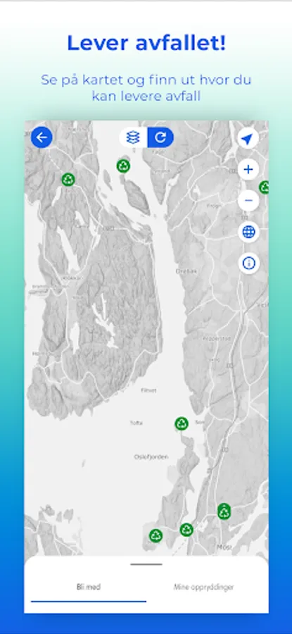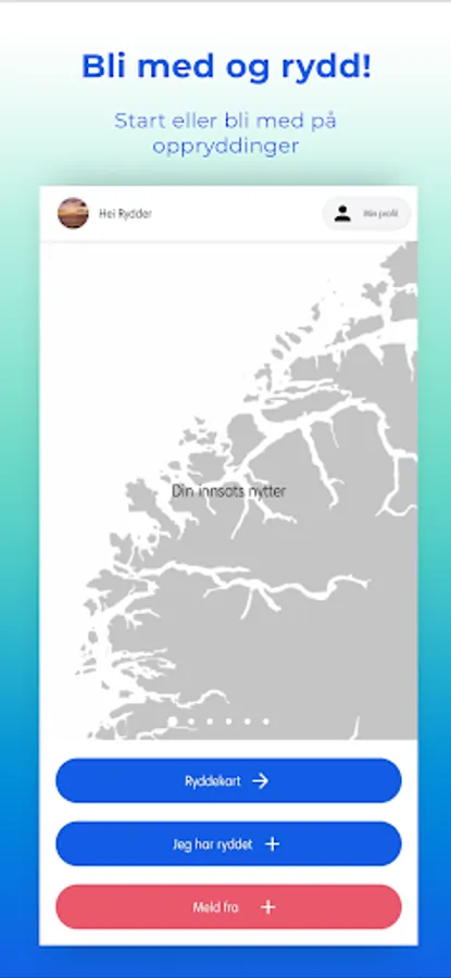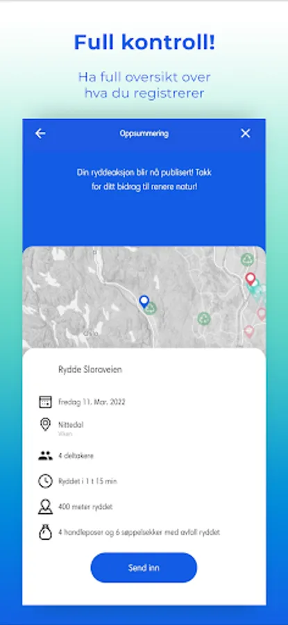 The app is connected and synchronized with www.ryddenorge.no which is a continuation of Ryddeportalen. If you used it and activate your user, numbers and data from previously completed actions are in Clear.