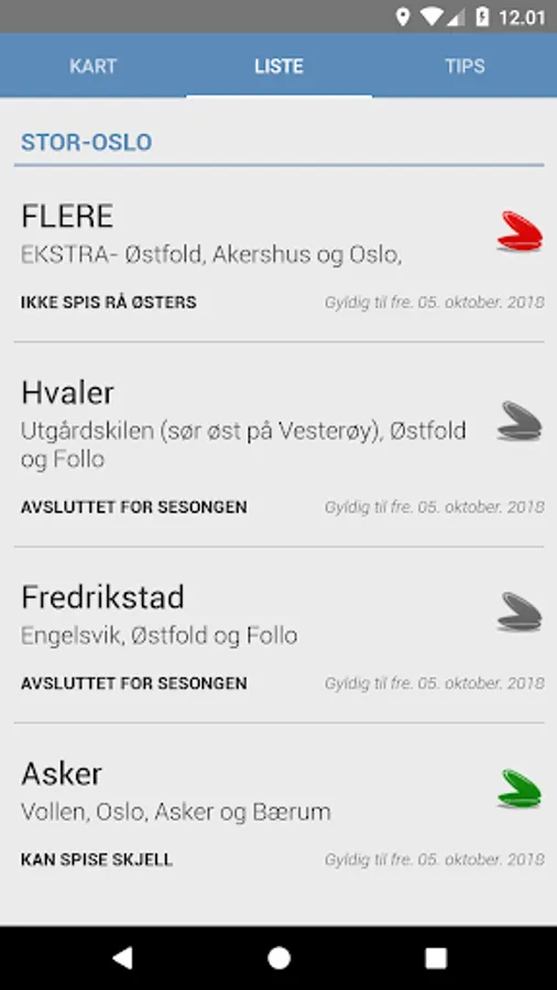 The list shows the locations sorted by the Norwegian Food Safety Authority.