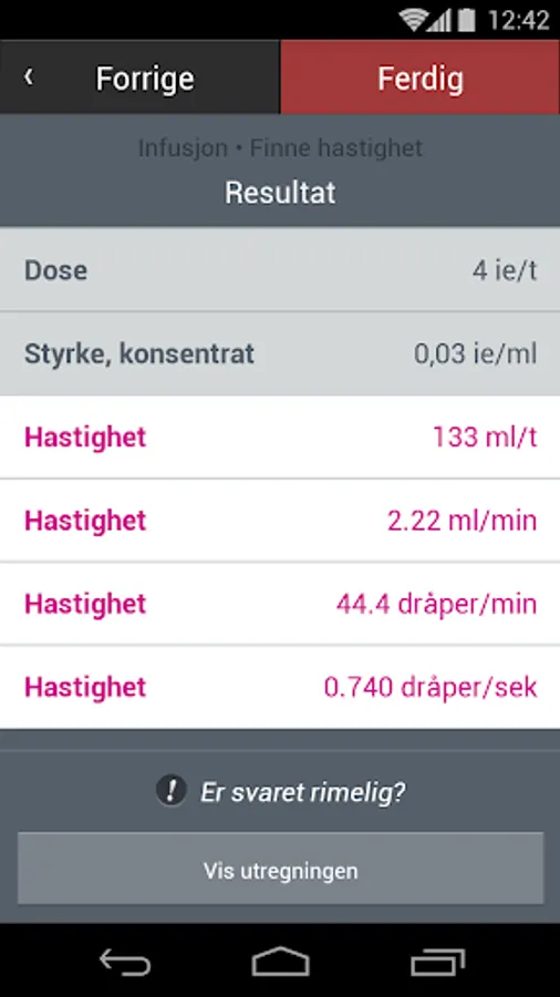 Healthcare professionals should always consider whether the answer is reasonable. Drug calculations should always be double checked. The app is an aid and does not change health professionals' responsibilities related to possible medication errors.