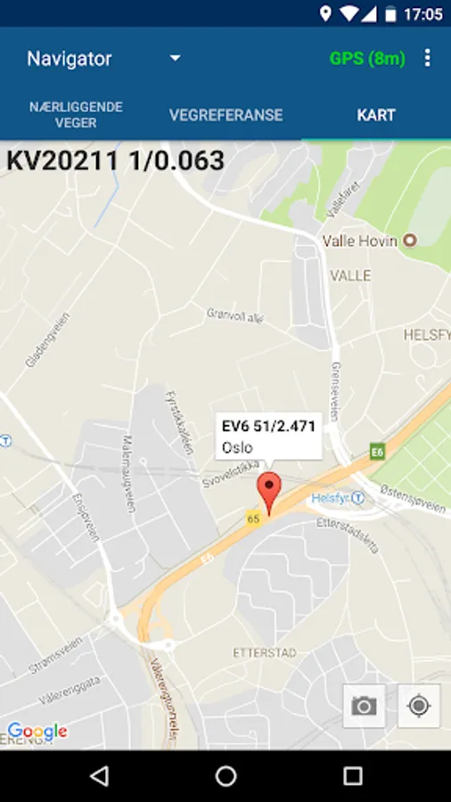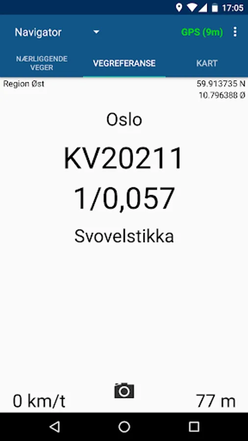Road network retrieved from NVDB and stored locally on the device so one does not need power outlet using. The program has functionality to capture images with vegreferanse stated on them, and one can apply up vegreferanser as one can see in the map or navigate.