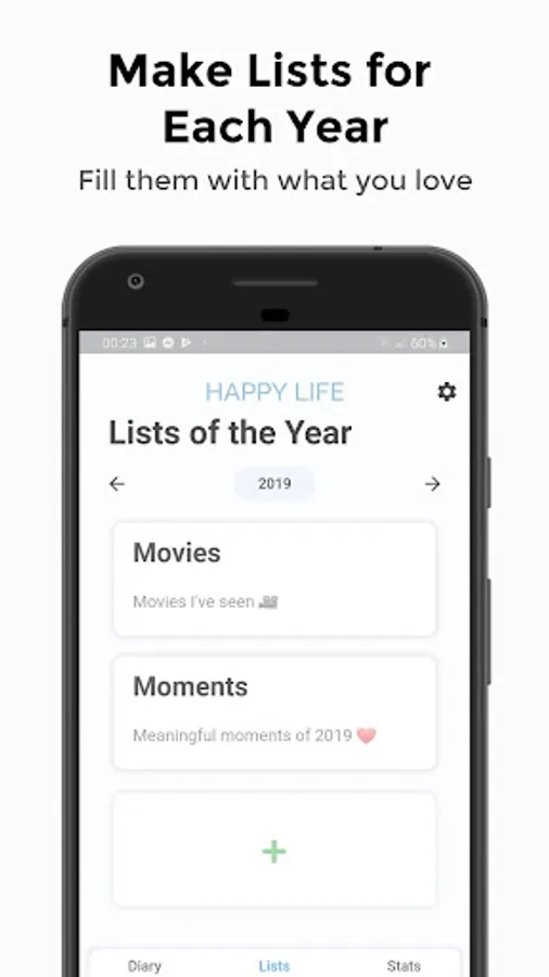 In Happy Life you are the master of your own yearly lists. You can note down whatever you want in your lists, and revisit them anytime. Common examples of such lists may be a bucket list for the year, movies you watched that year, places you visited, or hobbies you tried.