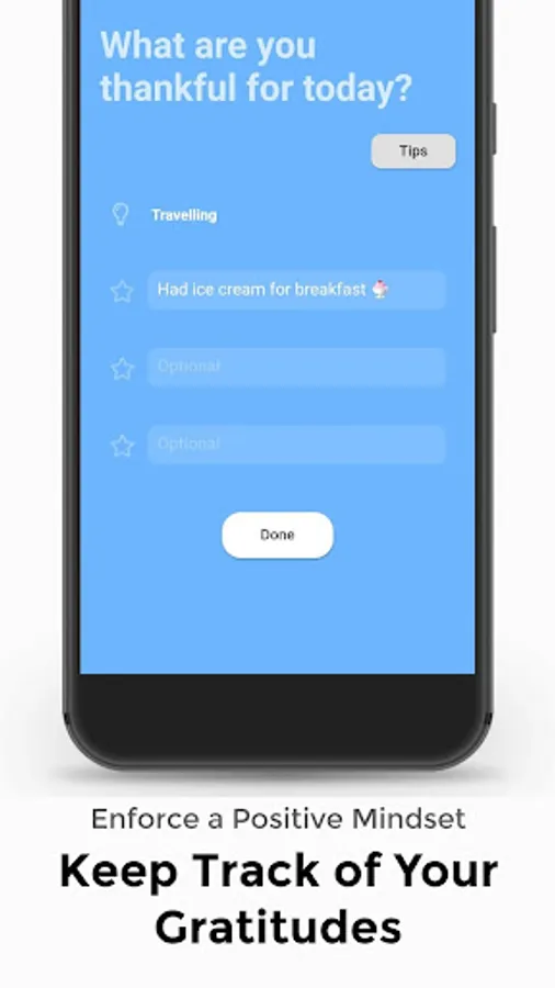Happy Life allows you to quickly and easily log your gratitudes every dary, and store them in a special journal for your gratitudes. Gratitude journals allows you to focus on what makes you happy, and can enforce a more positive mindset.