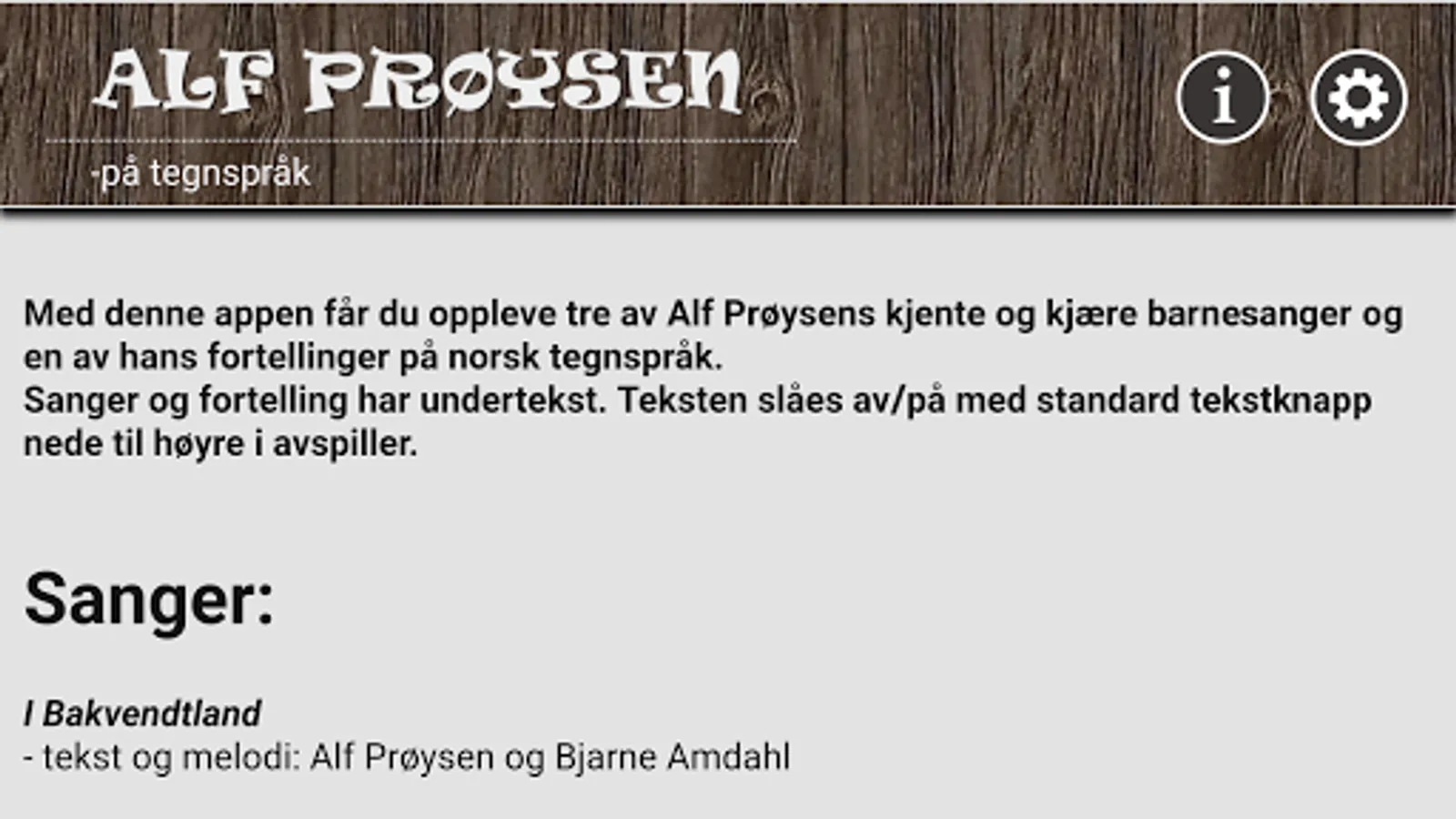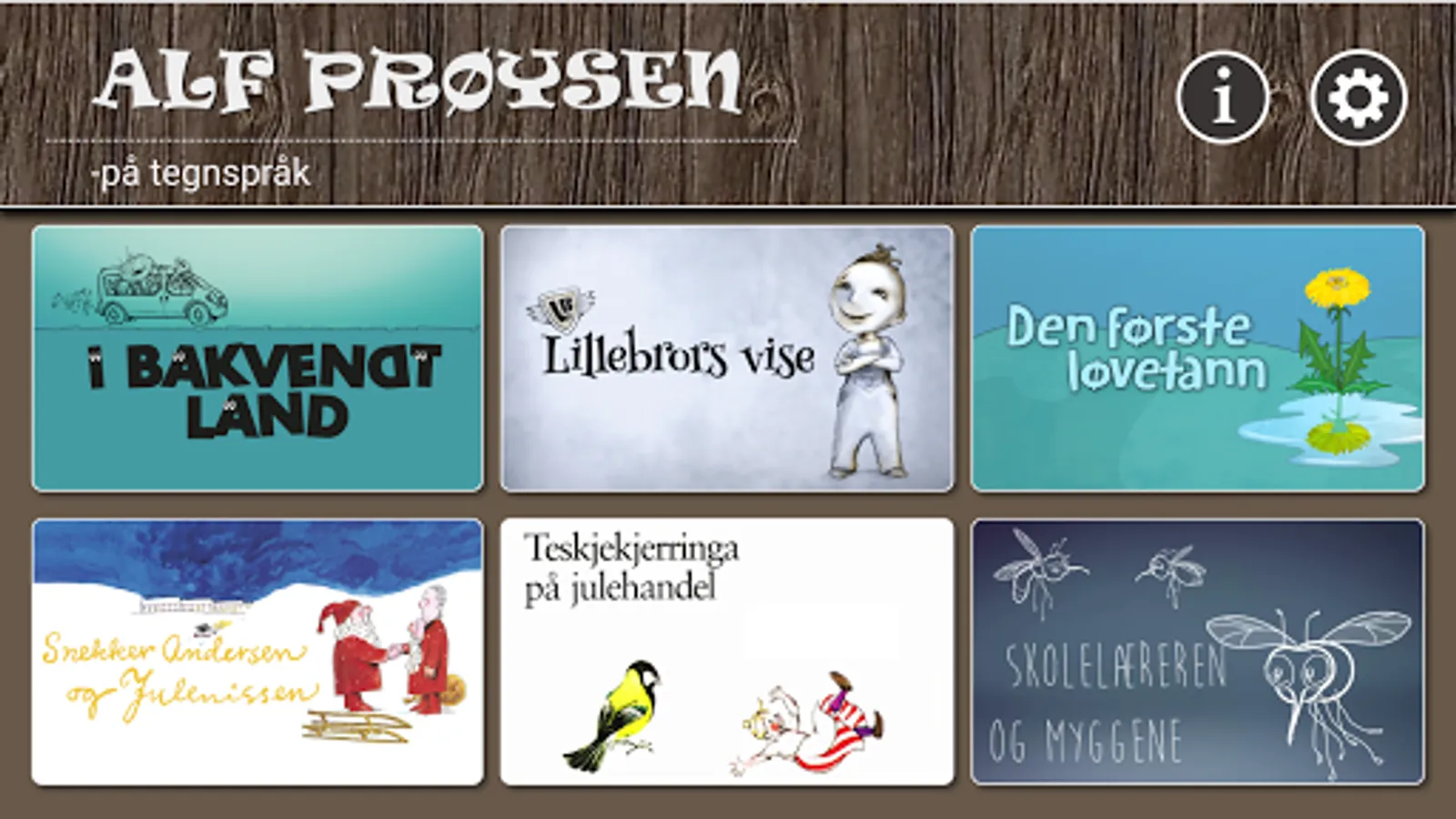With this app you can experience three of Alf Prøysens children's songs and three of his stories in Norwegian Sign Language.
