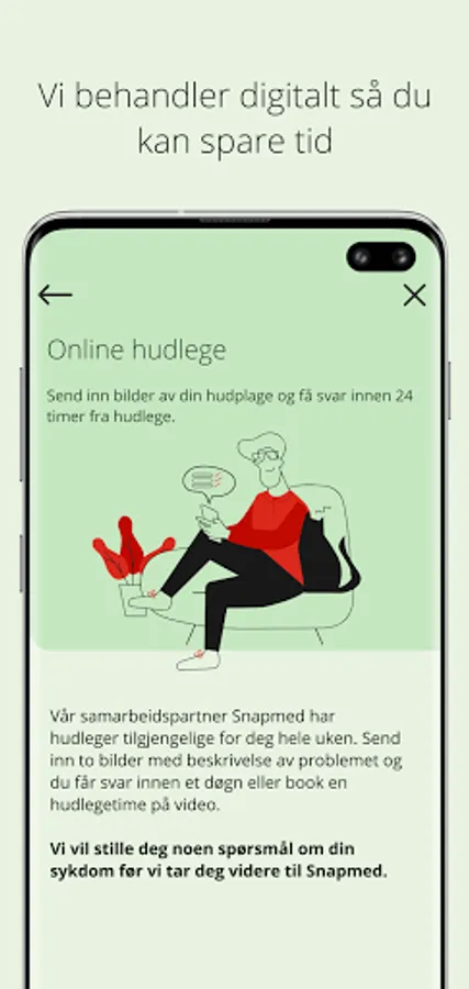 Large selection of digital health services such as doctor, psychologist and dermatologists online, drop-in doctor, self-help programs and useful articles on health.