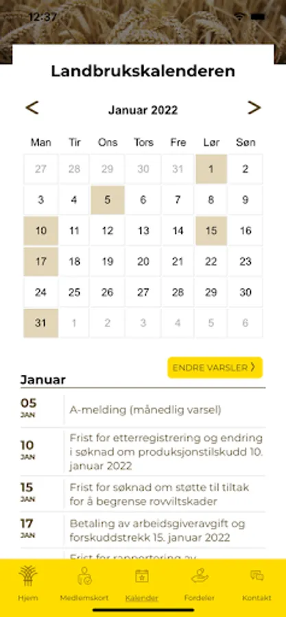 With the app, you can receive notifications about important deadlines for sole proprietorships in agriculture. Before using the app, however, it is important that you are aware that there may be errors or omissions in the date notifications. For example, certain important dates may have been missed or, exceptionally, the wrong date may have been entered in relation to a relevant deadline. Norges Bondelag is not responsible for such errors. The date notices are intended to serve as a reminder of important dates for enterprises in agriculture, but as a trader you yourself are responsible for making sure that the specified date is correct.
