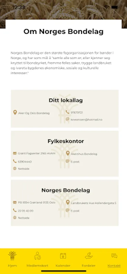 Get even more out of your membership. With the app, you have a membership card and an overview of all the benefits you have as a member of Norges Bondelag. You can update your own contact details directly in the app and you will find contact details for the Norwegian Farmers' Association and county associations.