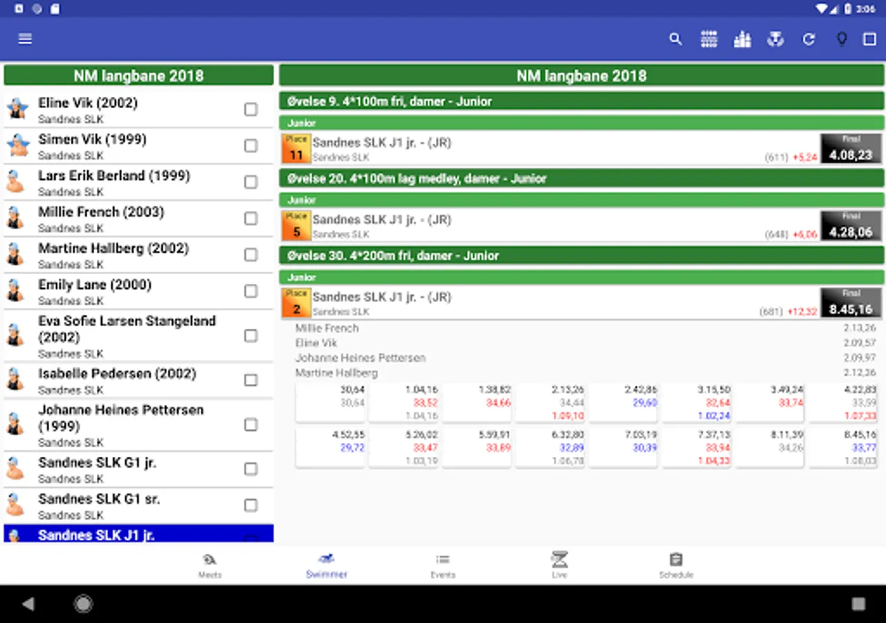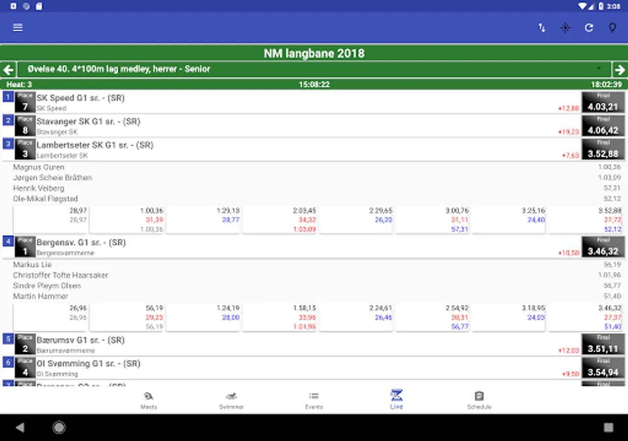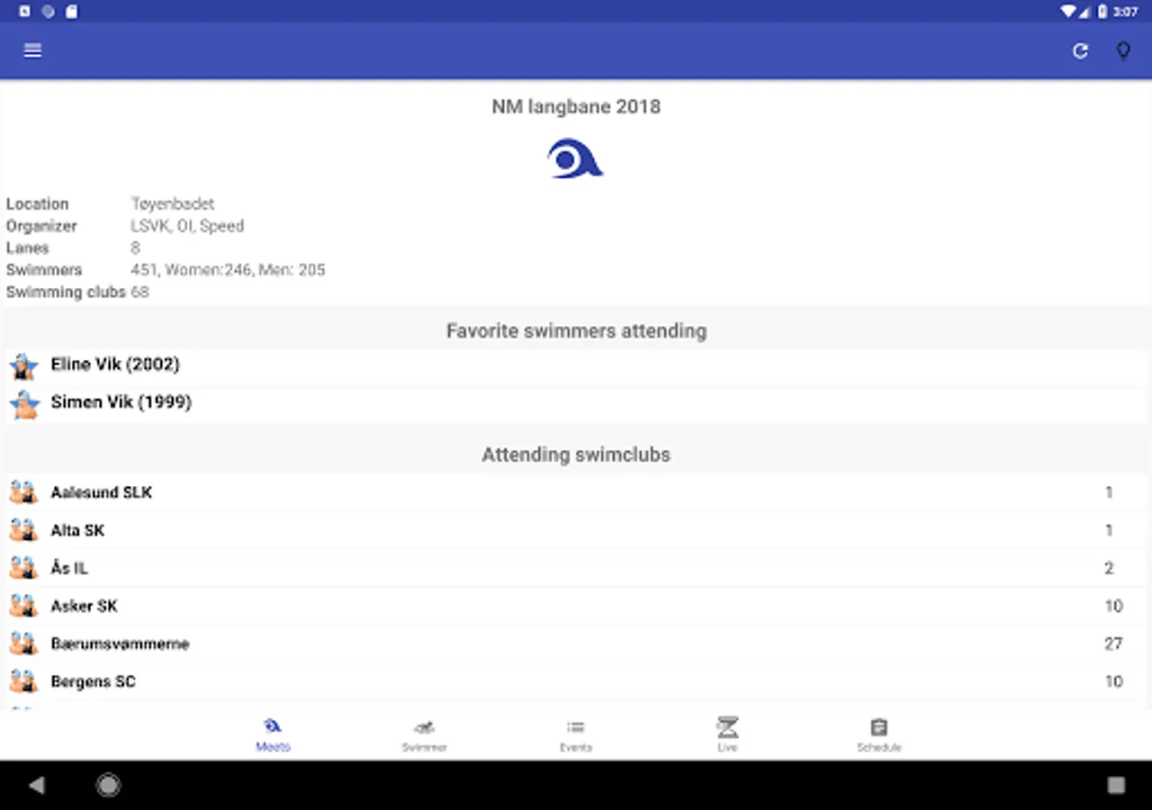 This application shows the results from the swimming competitions in Norway, which is also available free of charge on http://ltmobil.medley.no/