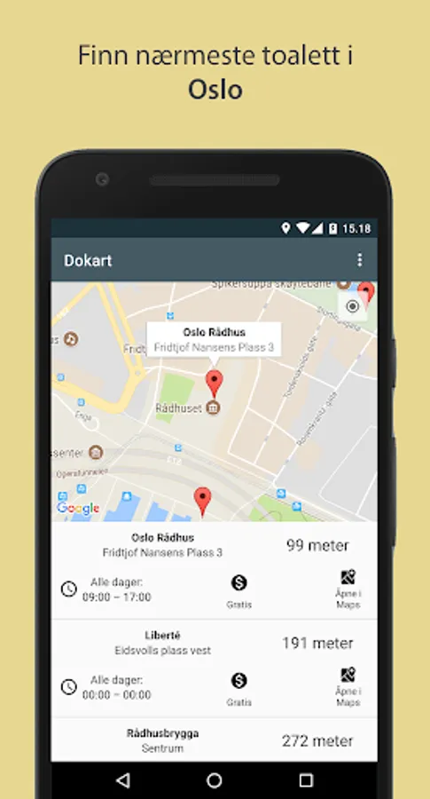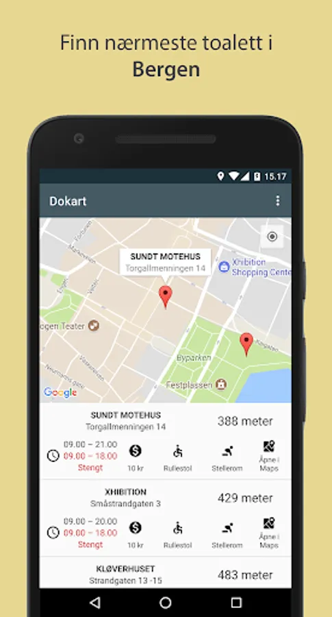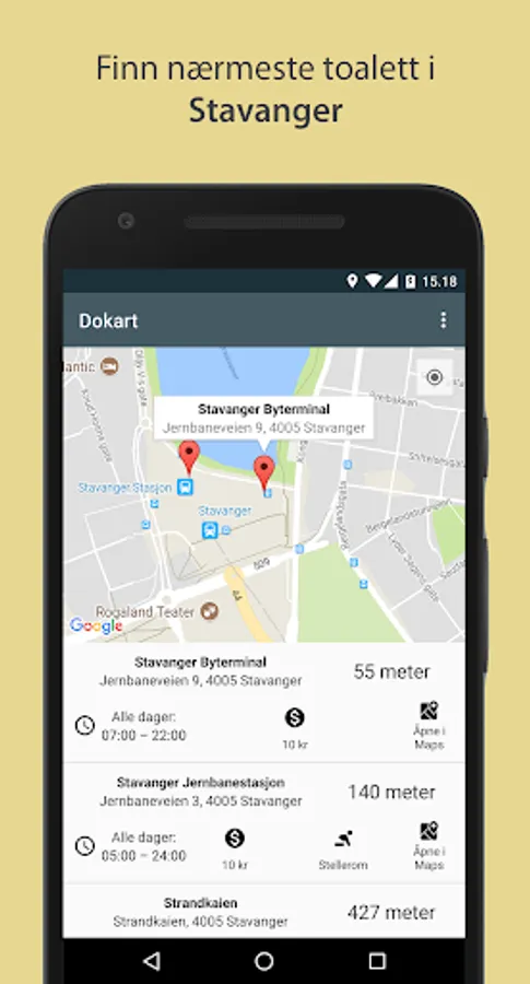 Dokart helps you find the nearest public toilets in Bergen, Stavanger, Oslo or Trondheim.