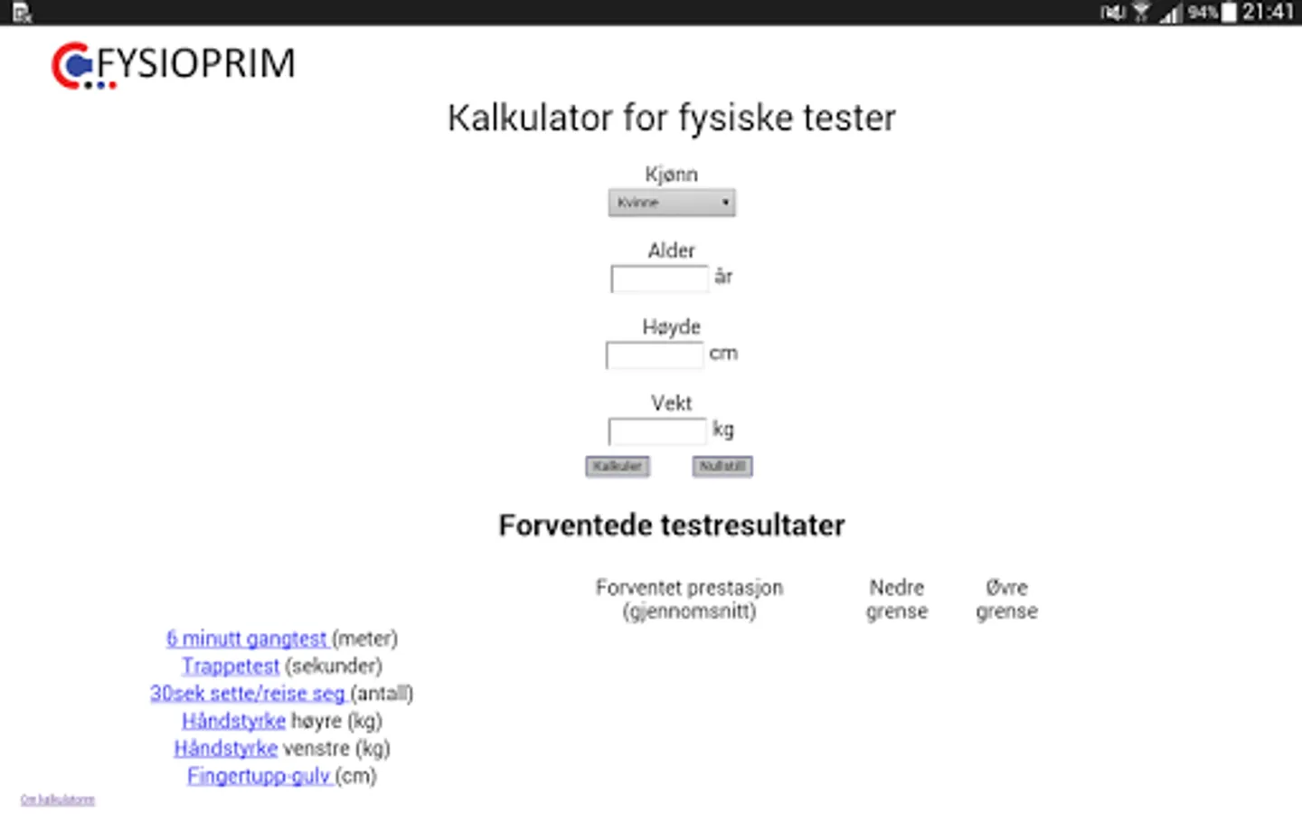 FYSIO PRIM calculator is a calculator where you can figure out what it is expected that a person should perform physical tests given their gender, age, height and weight.