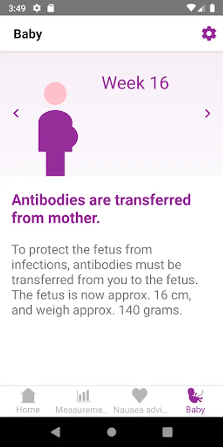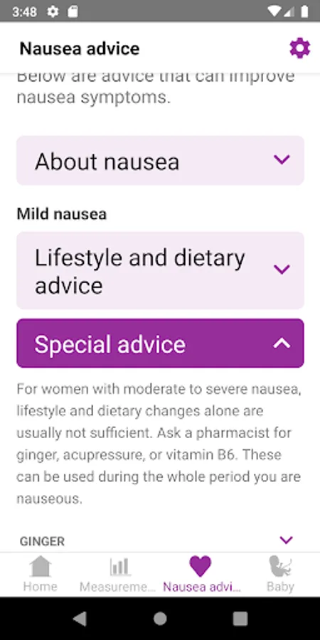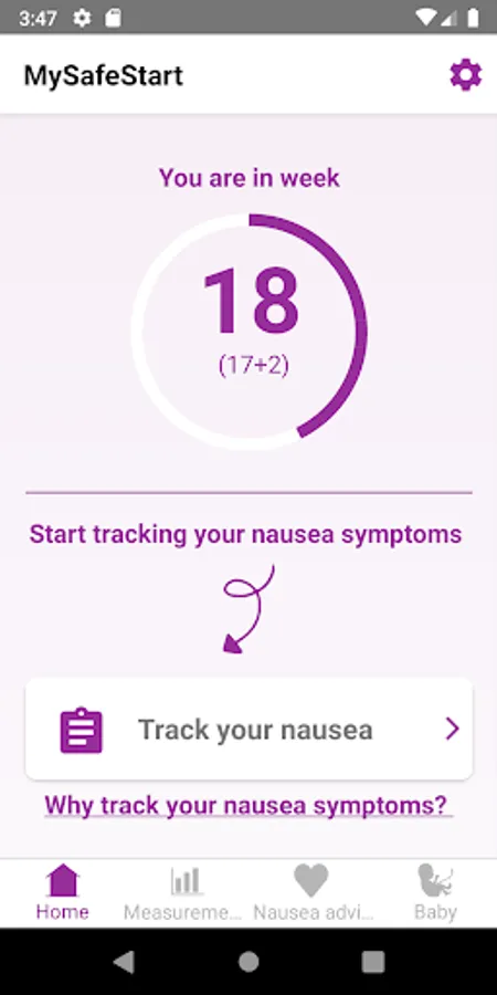 This app is developed by the University of Oslo, Norway. By tracking your nausea symptoms daily, the app uses the Pregnancy-Unique Quantification of Emesis (PUQE) score as a measuring instrument to classify your nausea intensity. The app will also provide advice tailored to your nausea intensity.